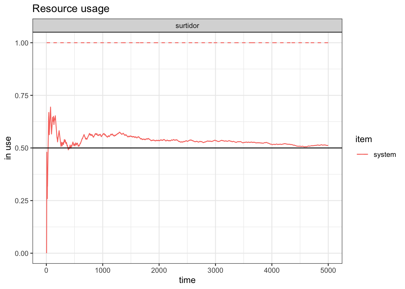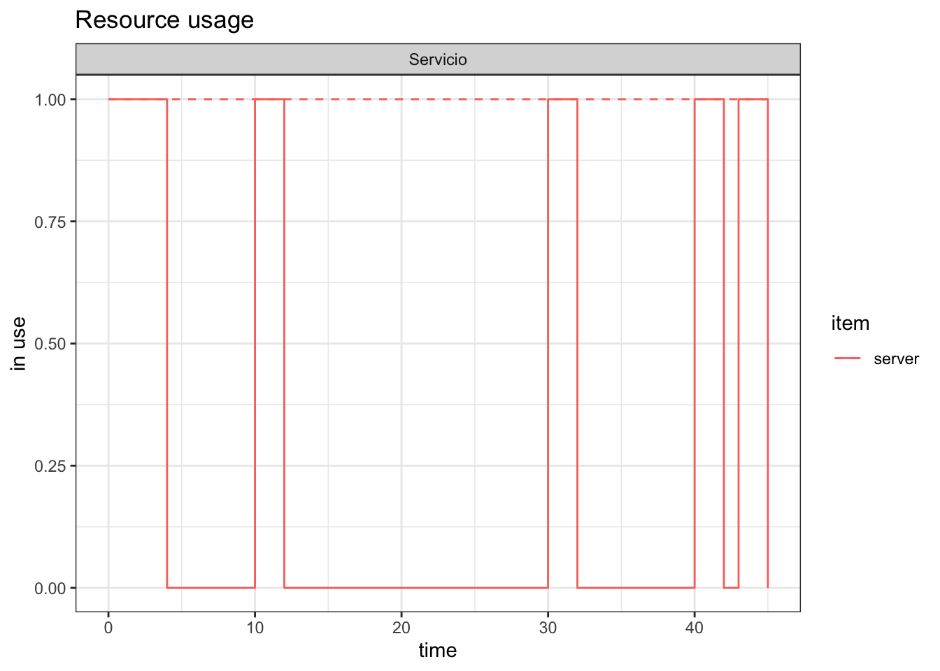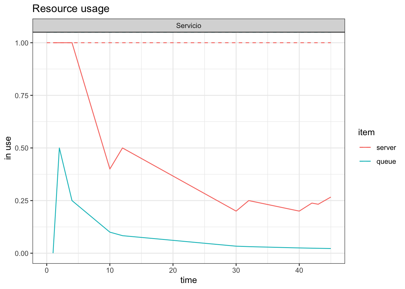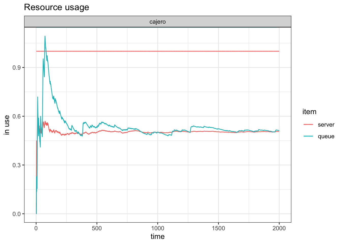 plot(resources, metric="usage", "cajero", items = c("server","queue"))