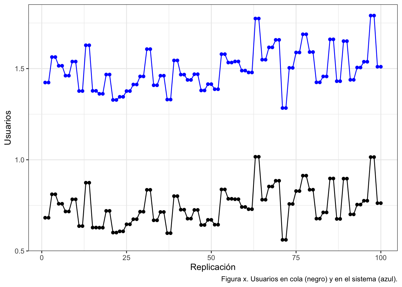 labs(x="Replicación",y="Usuarios",caption="Figura x. Usuarios en cola (negro) y en el sistema (azul).")