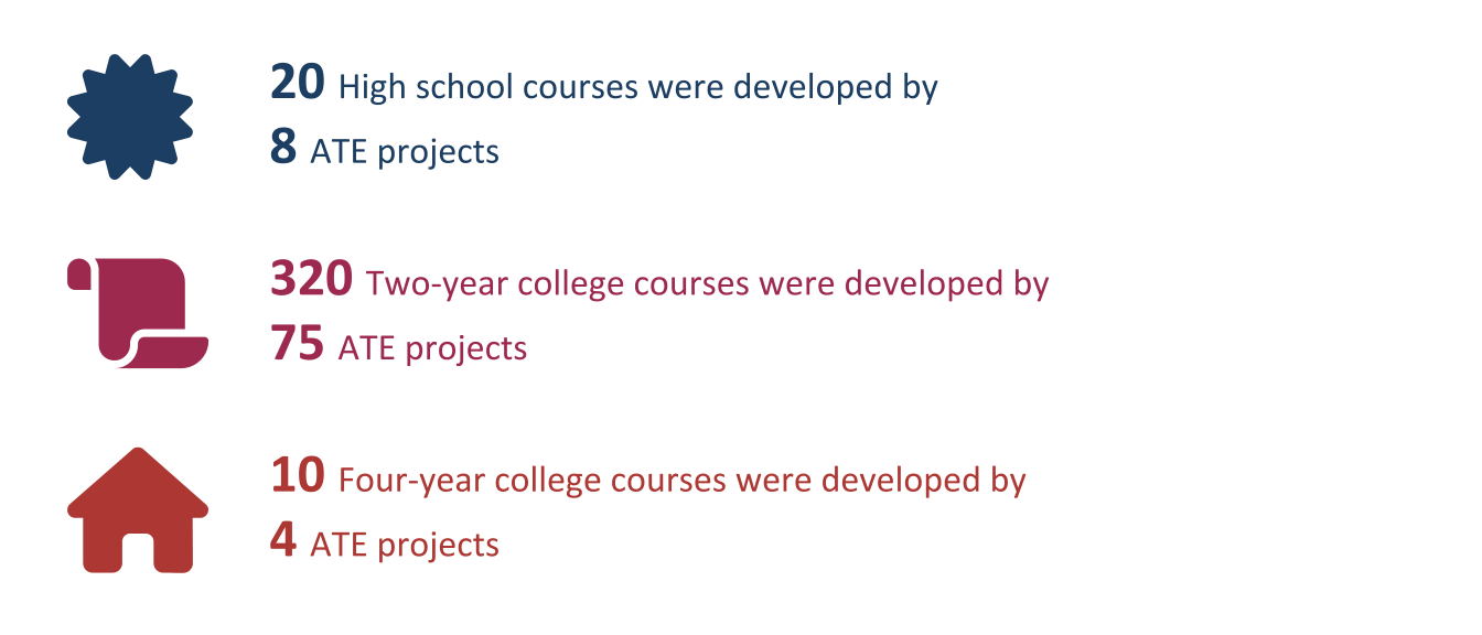 ATE PIs whose projects engaged in creating or substantially modifying academic courses were asked to identify the number and types of courses they created or modified, the academic levels of these courses, their primary delivery modes, and how many students enrolled in the courses. Some ATE projects engaged in course development as part of a larger initiative to develop or modify an entire degree or certificate program; others did so as a stand-alone effort.