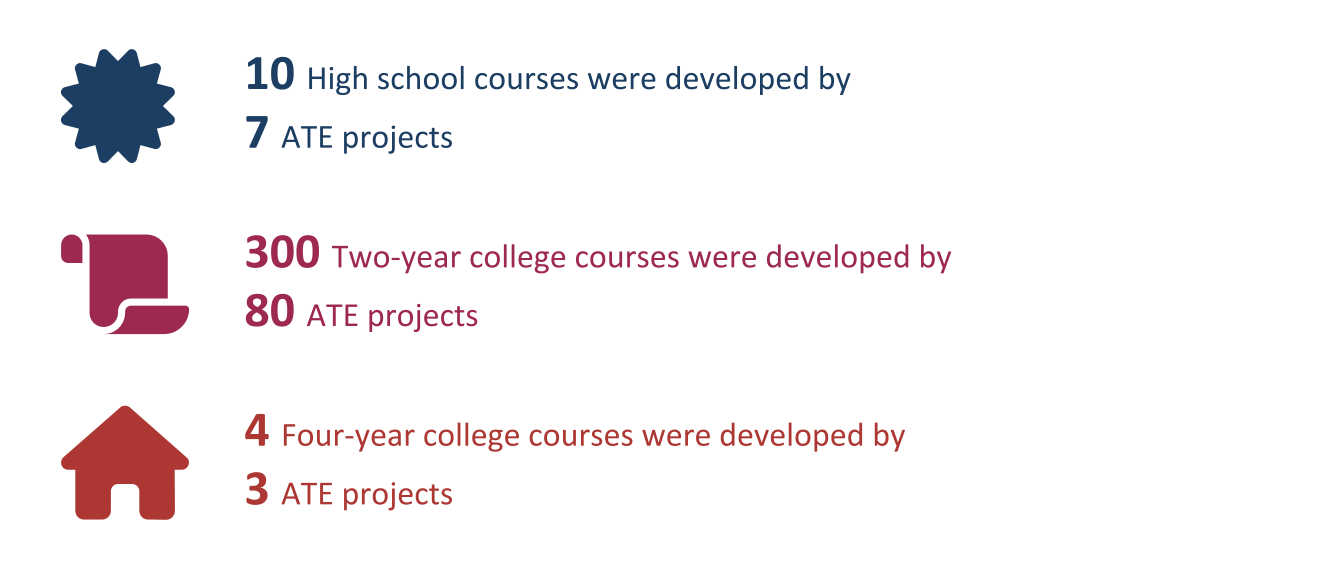 ATE PIs whose projects engaged in creating or substantially modifying academic courses were asked to identify the number and types of courses they created or modified, the academic levels of these courses, their primary delivery modes, and how many students enrolled in the courses. Some ATE projects engaged in course development as part of a larger initiative to develop or modify an entire degree or certificate program; others did so as a stand-alone effort.