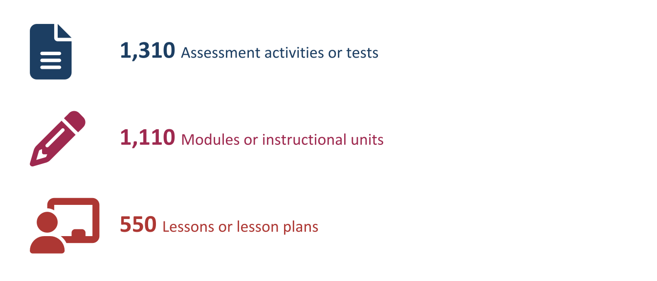Educational materials developed included assessment activities, modules or instructional units, lessons, lab experiments, curricula, case studies, instructor guides, and textbooks.