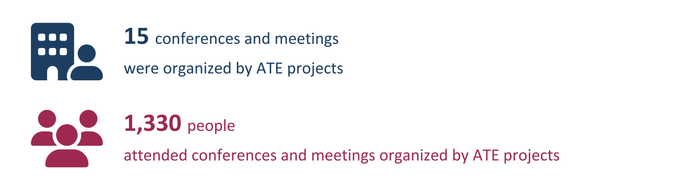 One ATE project was explicitly funded to coordinate conferences or meetings in 2023. Six additional projects hosted conferences in 2023. These 7 projects hosted a total of 15 conferences or meetings, with attendance that ranged from 3 to 810 people. ATE PIs identified the purposes of these events as networking and professional development, disseminating best practices, and bringing together stakeholders from industry and education.