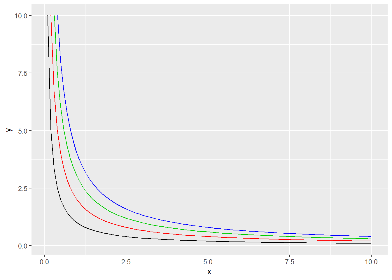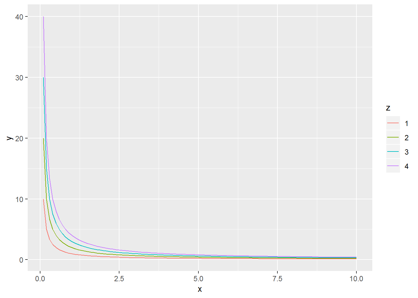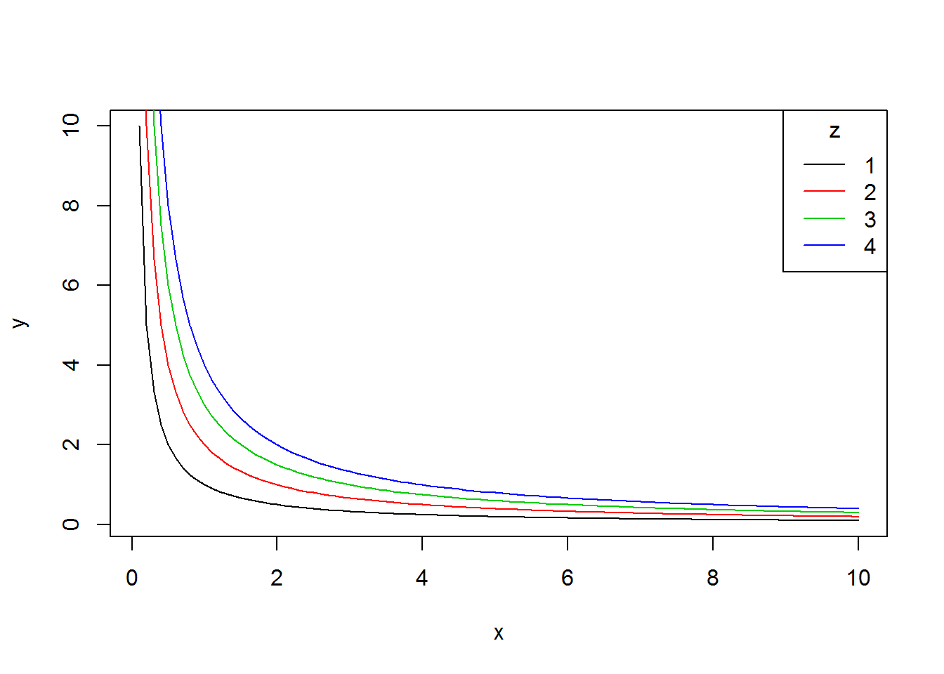 函数 \(xy = z\),\(z\) 分别取值1、2、3、4, \(x\) 和 \(y\) 的取值区间为 (0, 10],如何画出这4条曲线?(出处)