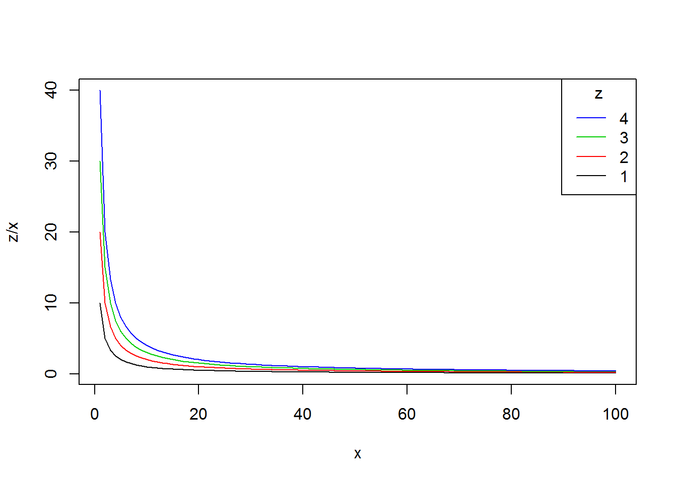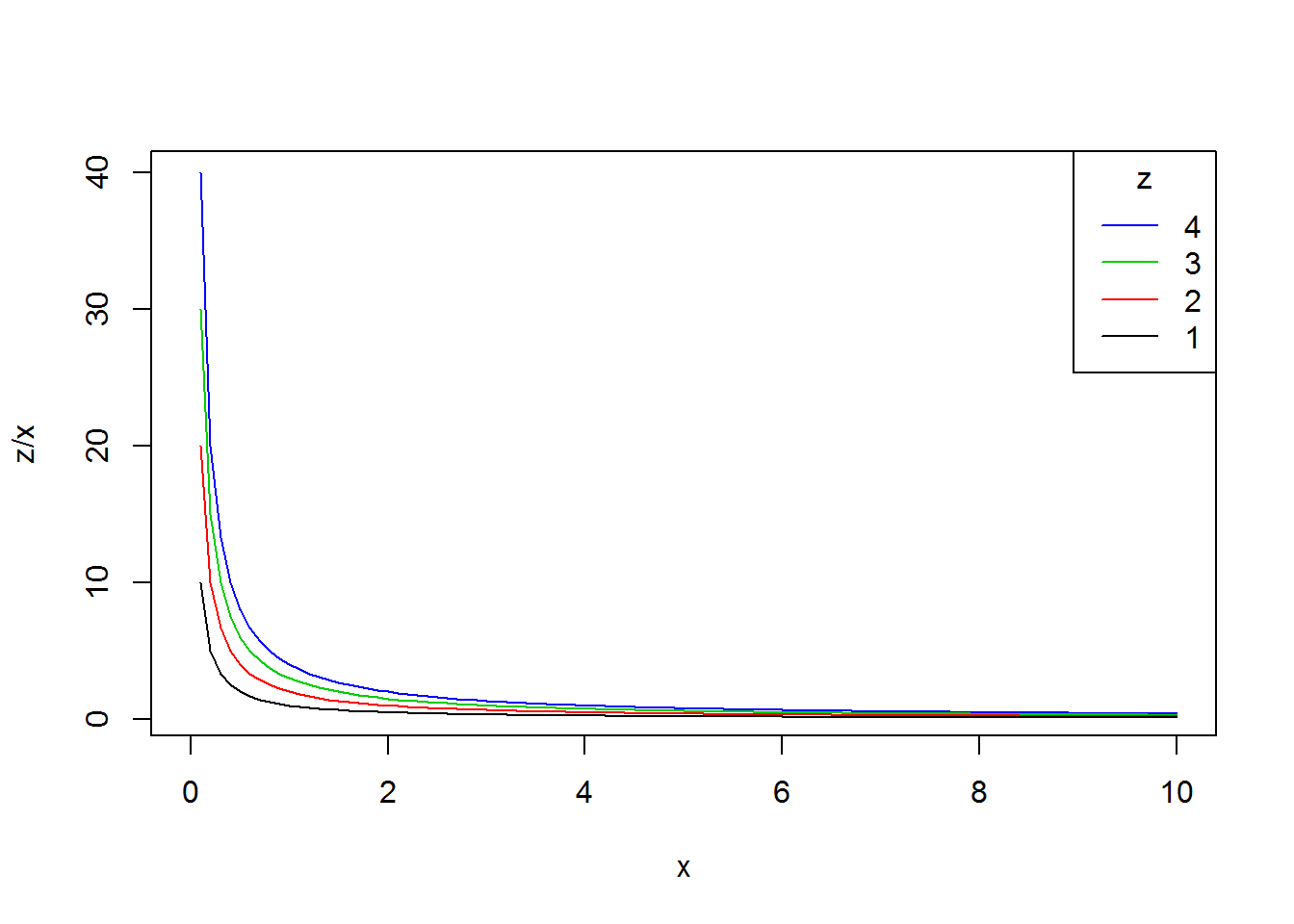 curve(z / x, 0, 10, add = z < 4, col = z)