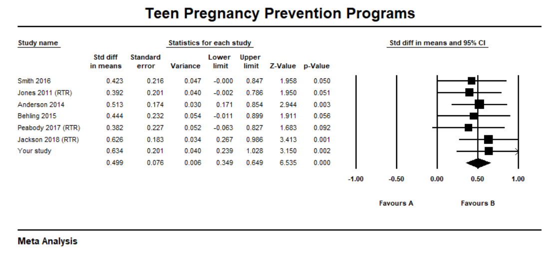 Finally, because the evaluation was a high quality experimental design, the committee urged you to write it up and submit it to a reputable social work research journal. You do so and some time later you notice that it is included in an updated meta-analysis of teen pregnancy prevention.