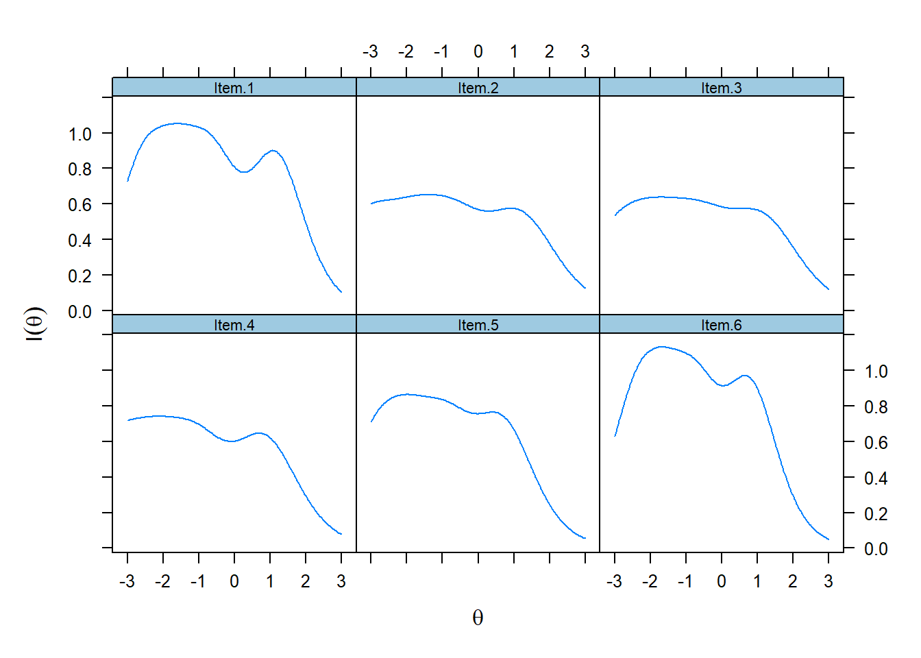 The estimated IRT parameters are shown above. The values of the slope (a-parameters) parameters ranged from 1.44 to 1.92. A slope parameter is a measure of how well an item differentiates respondents with different levels of the latent trait. Larger values, or steeper slopes, are better at differentiating theta. A slope also can be interpreted as an indicator of the strength of a relationship between and item and latent trait, with higher slope values corresponding to stronger relationships. Item 6 was the most discriminating items with a slope estimate of 1.92 while Item 3 was the least discriminating item with a slope estimate of 1.44.