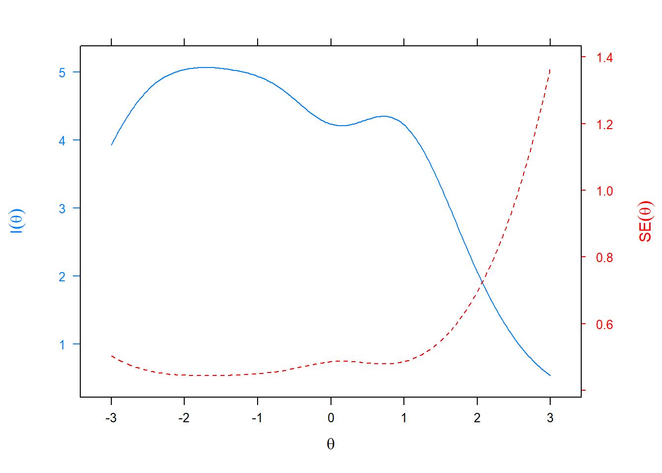 One particularly helpful IRT capacity is that information for individual items can be summed to form a scale information function. A scale information function is a summary of how well items, overall, provide statistical information about the latent trait. Further, scale information values can be used to compute conditional standard errors which indicate how precisely scores can be estimated across different values of theta.