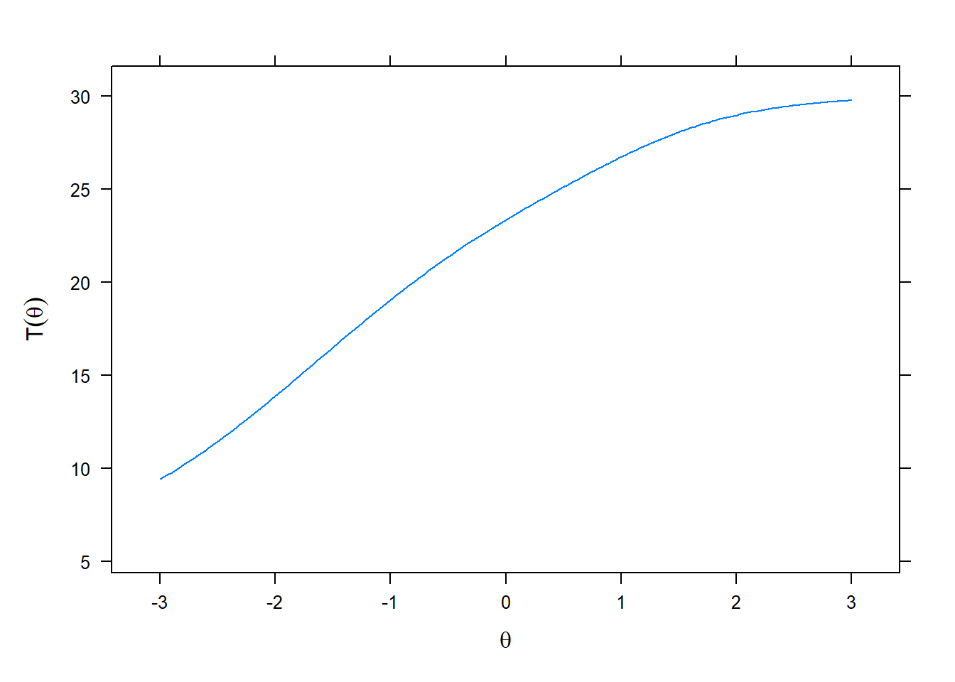 The scale characteristic function can be graphically displayed as shown above. It has a straightforward use; for any given estimated theta score we can easily find a corresponding expected true score in the summed scale score metric. These true score transformations often are of interest in practical situations where scale users are not familiar with theta scores. Also, true score estimates can be used in other important statistical analyses and are often improvements over traditional summed scores.