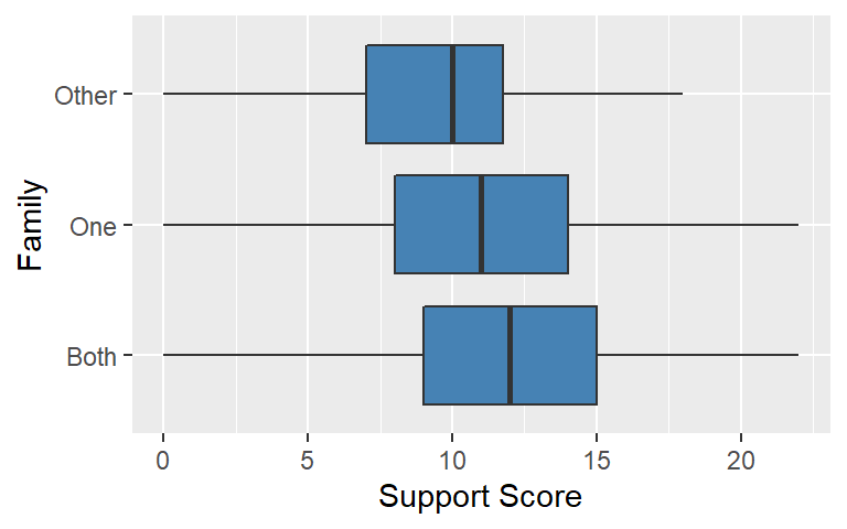 In this example, we are interested in the research question: Is there a relationship between parenting arrangement and support? The literature suggests that family composition and perceived levels of support are related with families with both parents tending to be more supportive that an alternative parenting arrangement (we should note that family composition is admittedly more complicated than just parenting arrangements). The following three-level boxplot provides insights into the relationship: