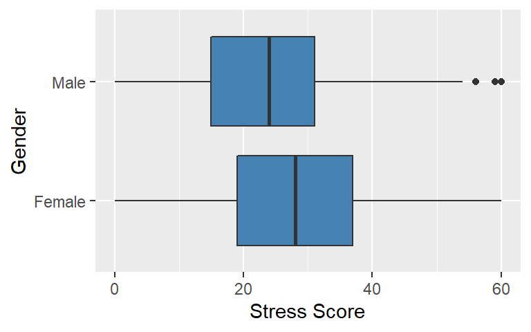 Our obtained p-value = .003 indicates that we reject the null hypothesis of no difference between male and female stress scores and conclude there is a statistically significant relationship between the two with females having higher stress scores, on the average, than males. Further, following the Cohen effect size framework where a d = .3 is a small effect size, d = .5 is a medium effect size, and d = .8 is a large effect size, we conclude there is a small effect size – Cohens d = .31 – thus the practical significance of the relationship between gender and stress is minimal.