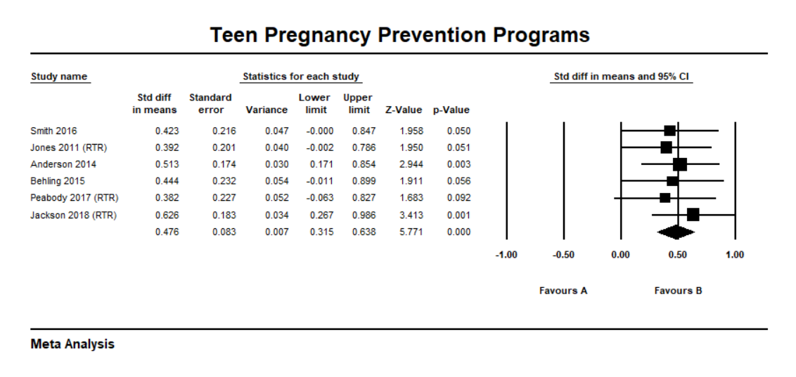 Finally, because the evaluation was a high quality experimental design, the committee urged you to write it up and submit it to a reputable social work research journal. You do so and some time later you notice that it is included in an updated meta-analysis of teen pregnancy prevention.