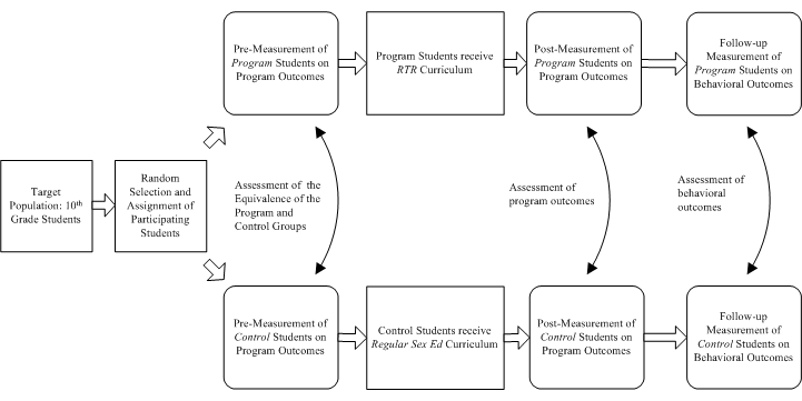 - Select a random sample of students from the 10th grade population and randomly assigned students to either the RTR program group (intervention group) or the regular sex education group (control group).