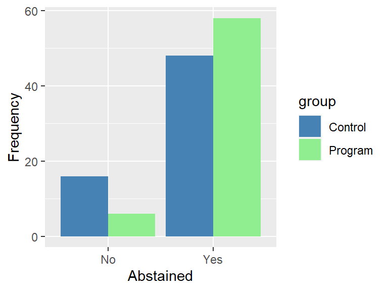 Since one of the goals of RTR is to encourage abstinence, you focus your three-month follow-up analysis on a simple yes-no question about whether or not a student had been abstinent during that time period. You can display your results in a grouped bar chart: