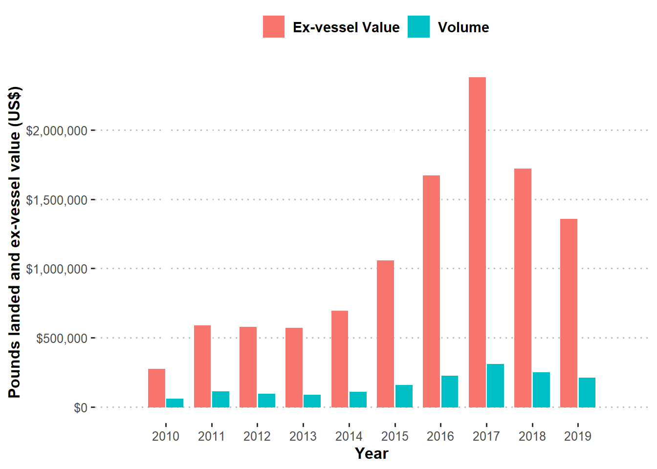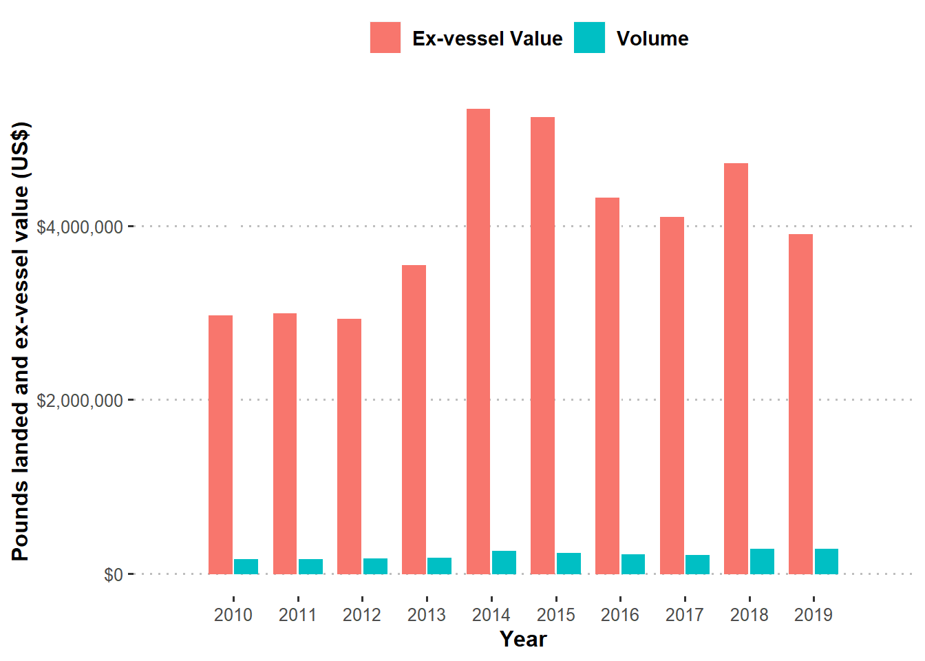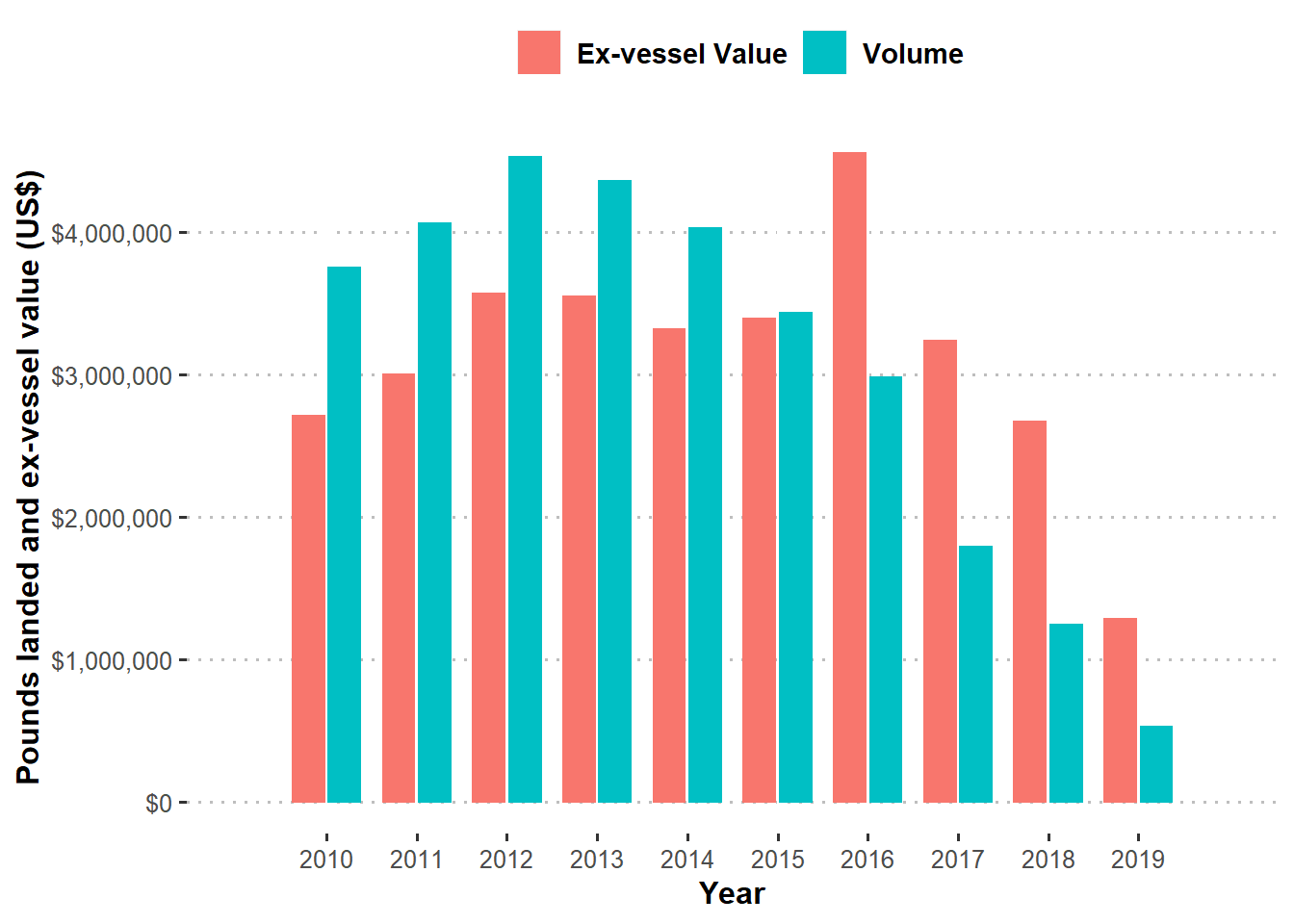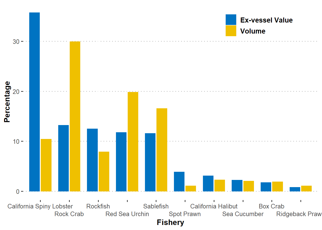 Percent contribution of ex-vessel value and volume of landings for the top regional commercial fisheries landings in Santa Barbara Harbor, 2019.