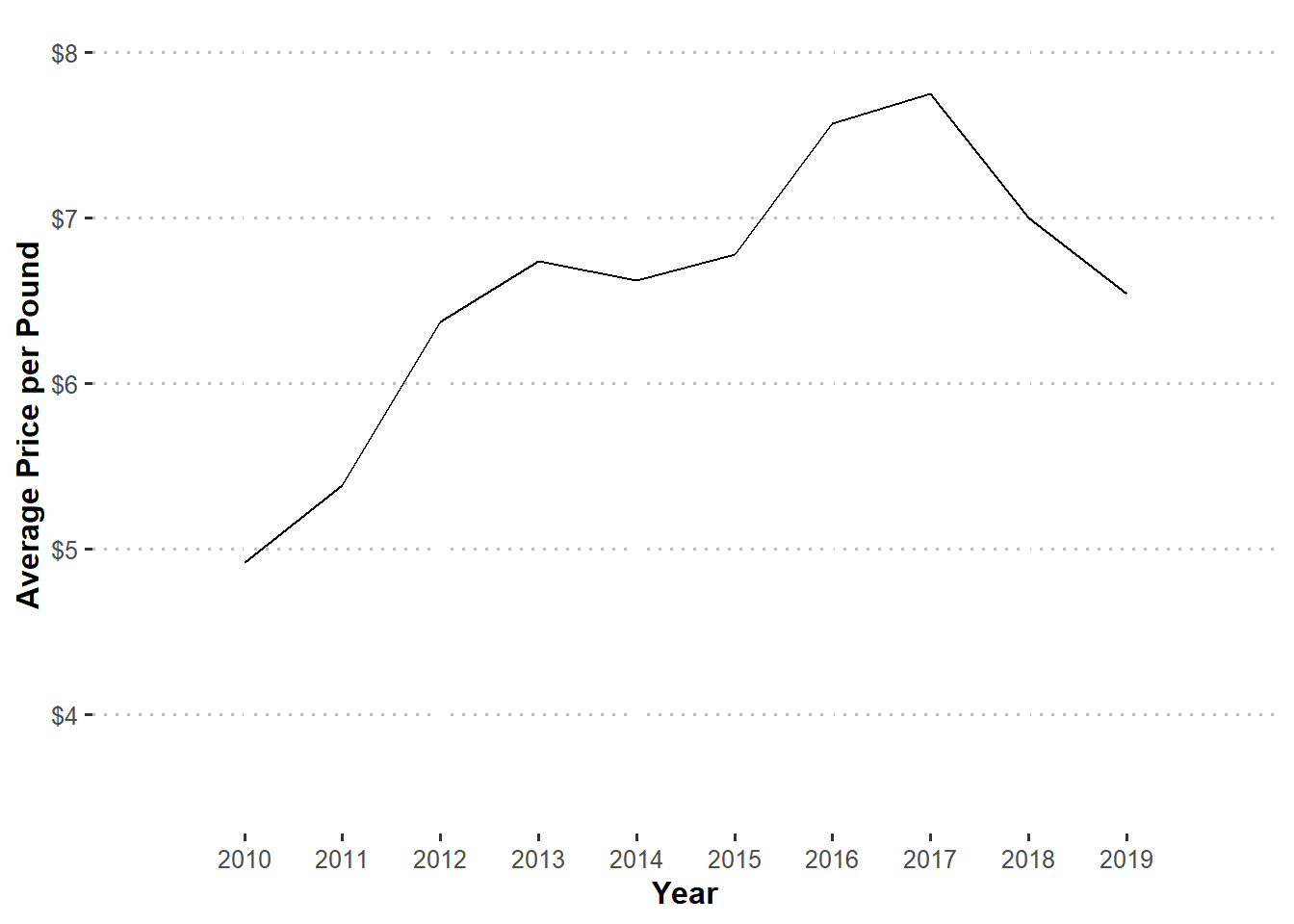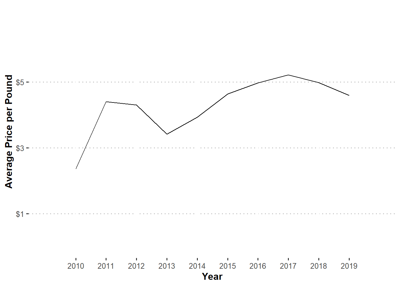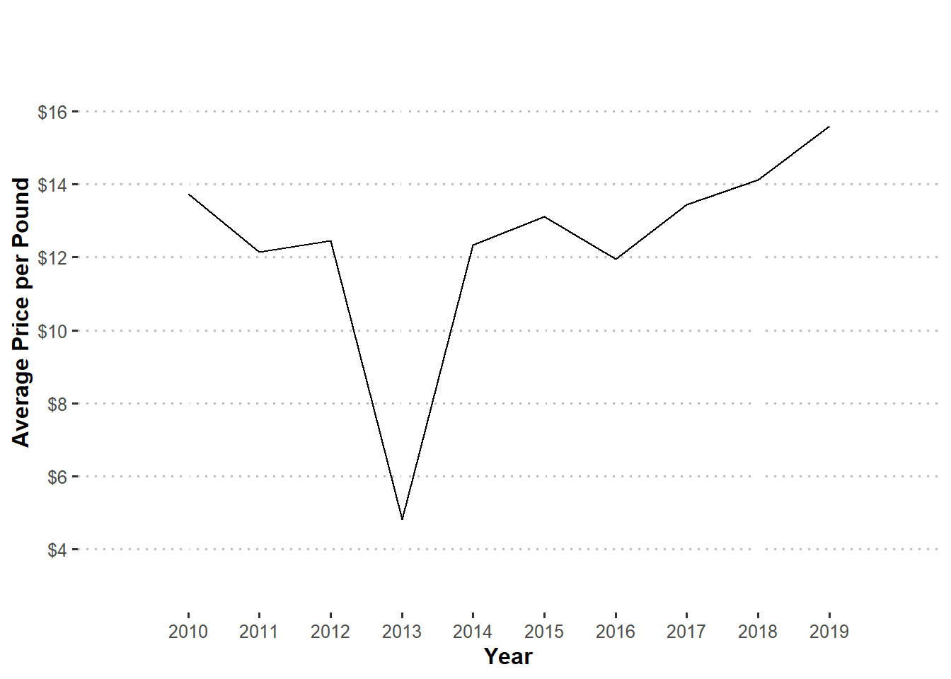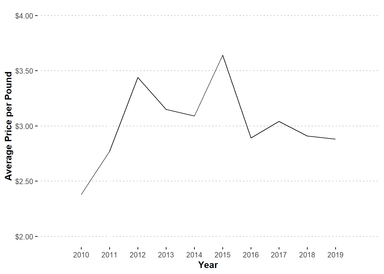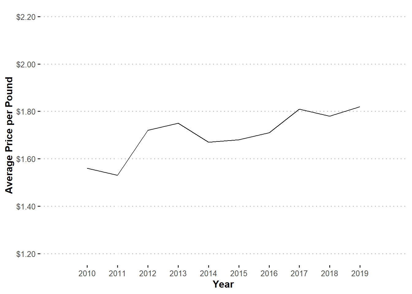 The price of Rock Crab has not changed much in the last 10 years, averaging $1.60 per pound.