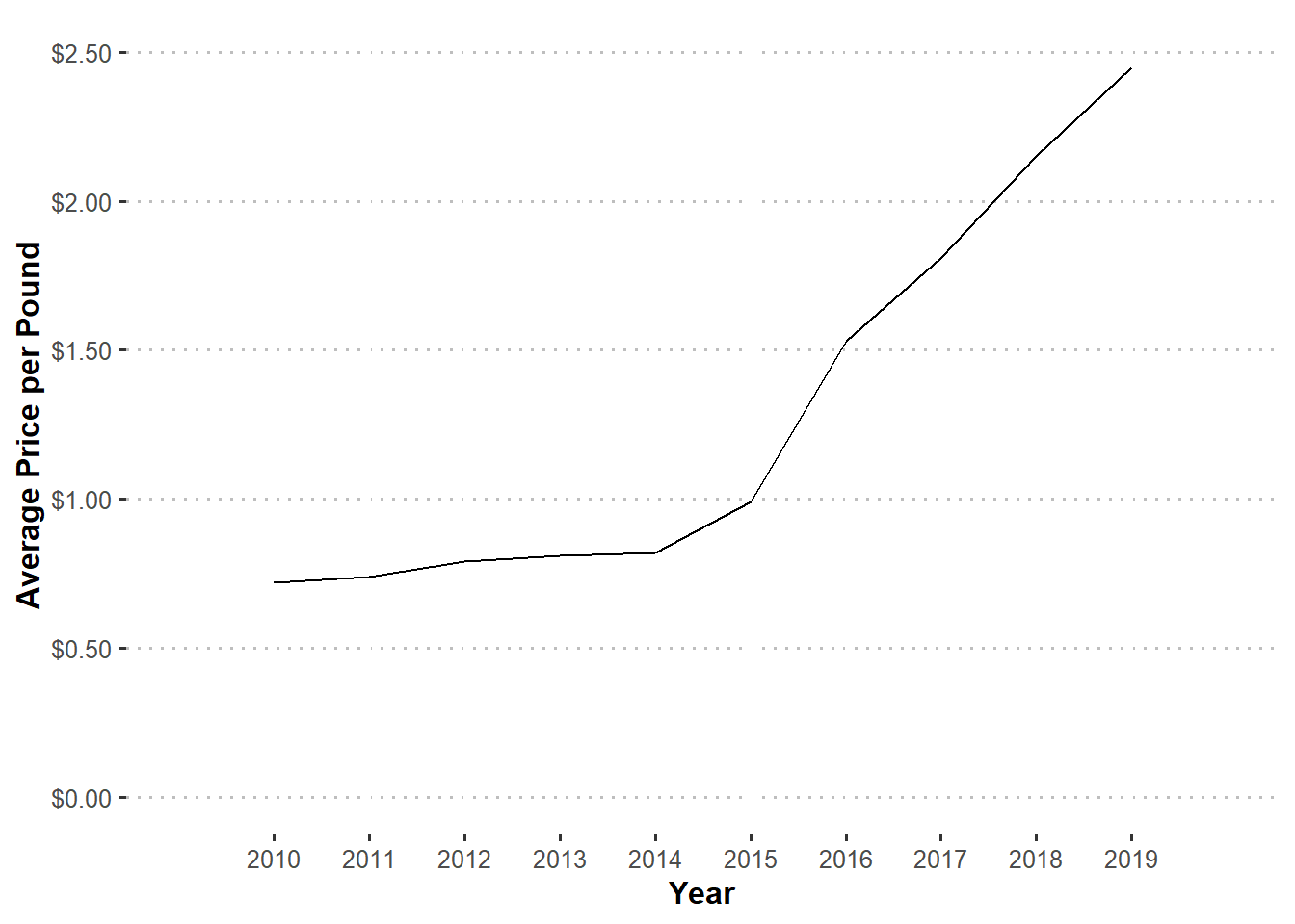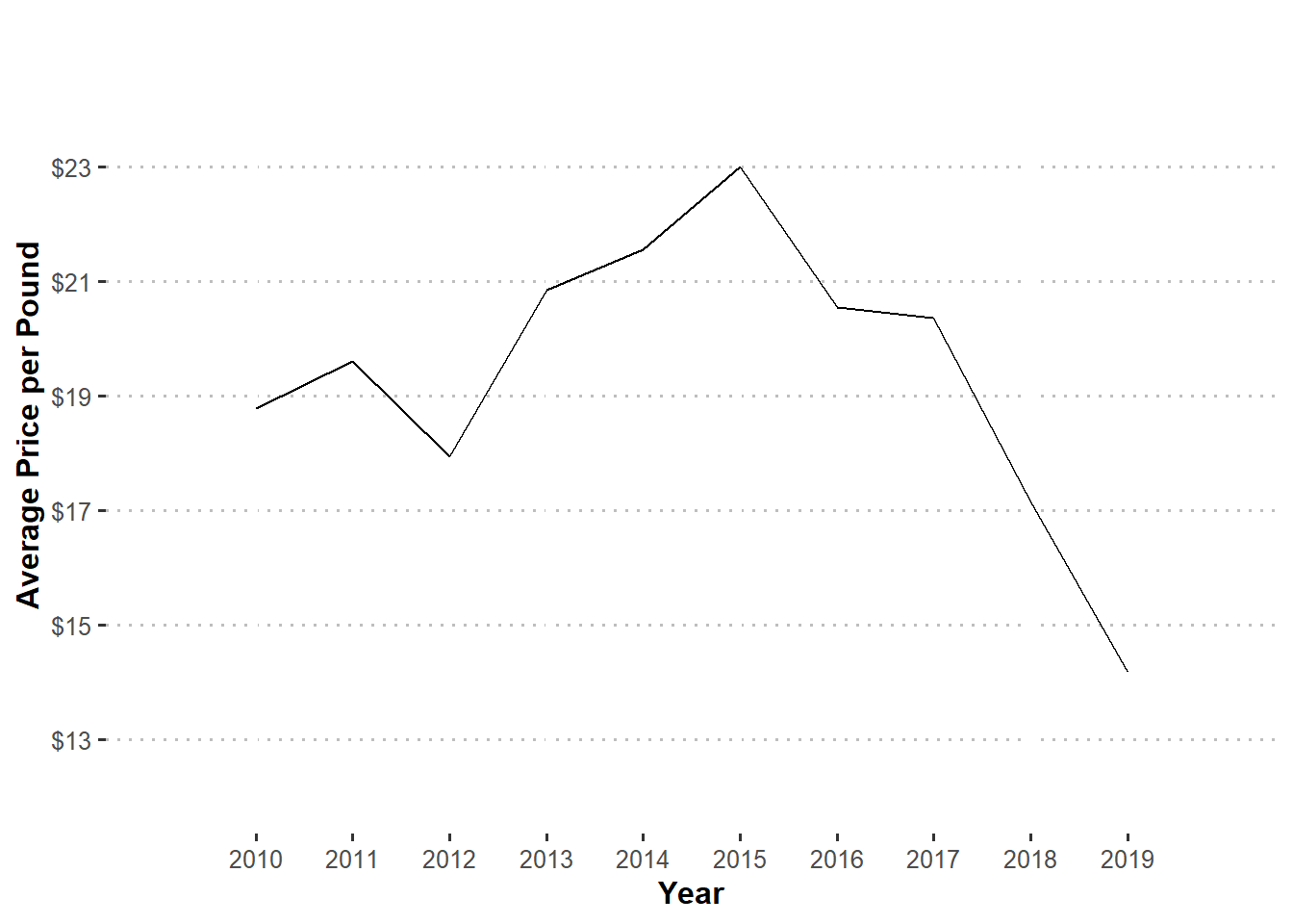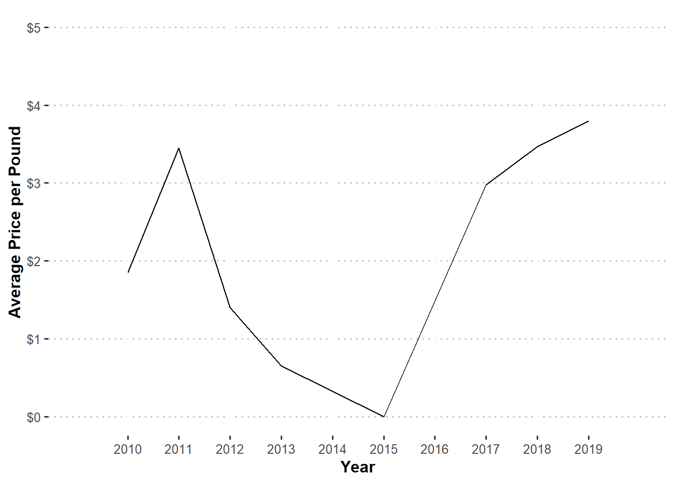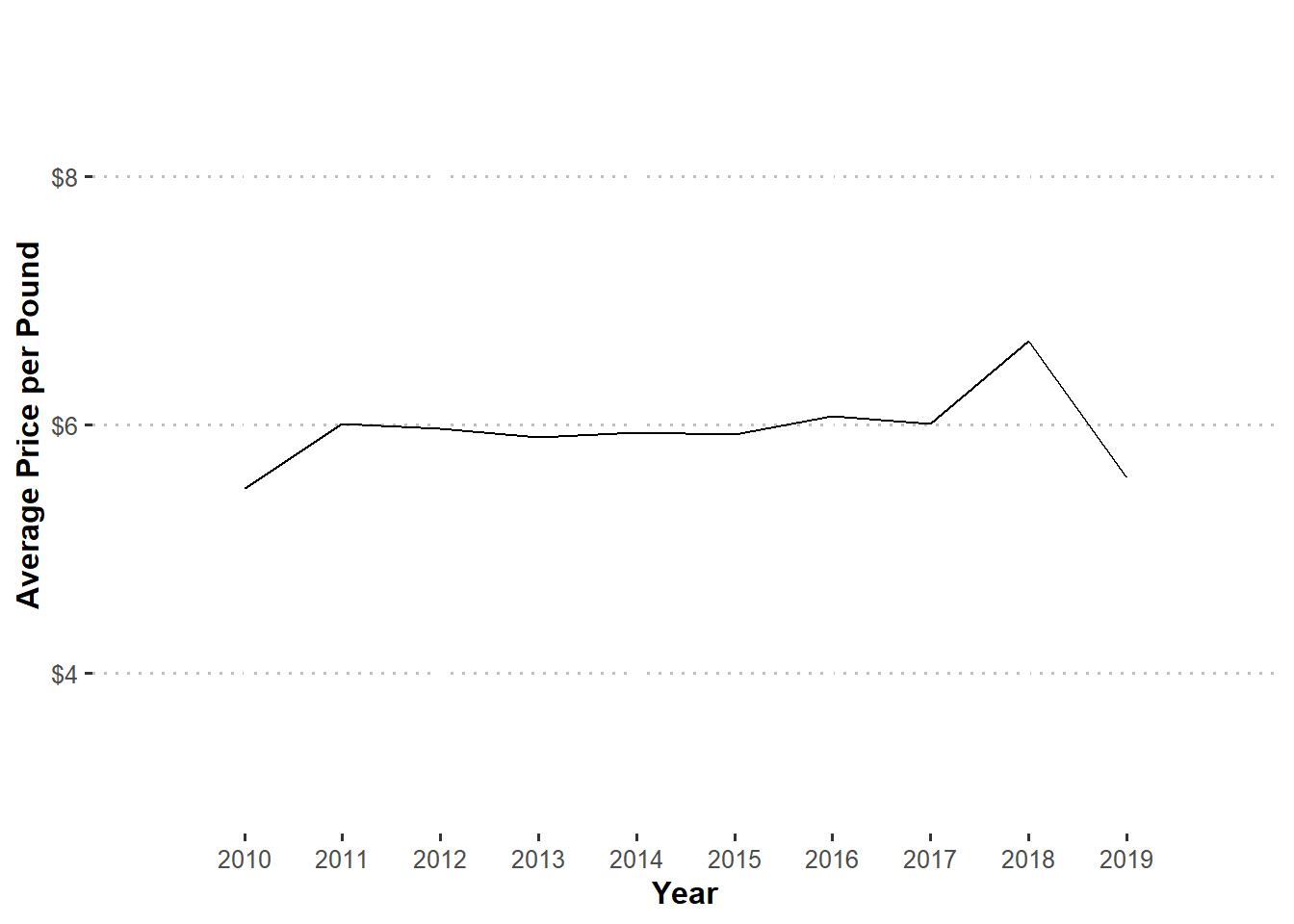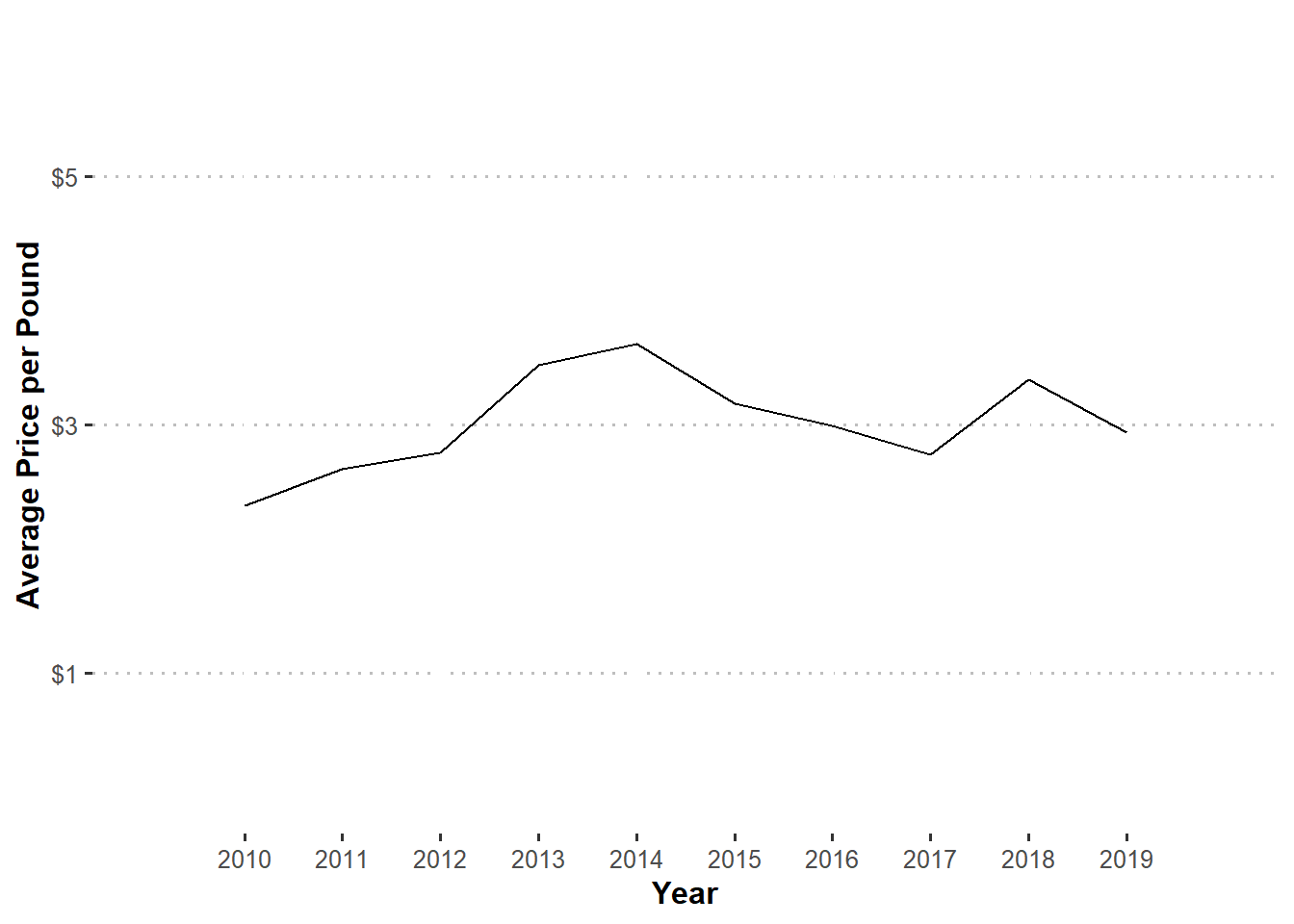 The price of Rock Crab has not changed much in the last 10 years, averaging $1.60 per pound.
