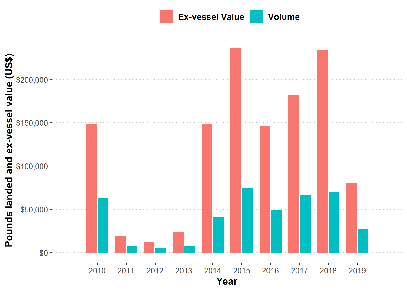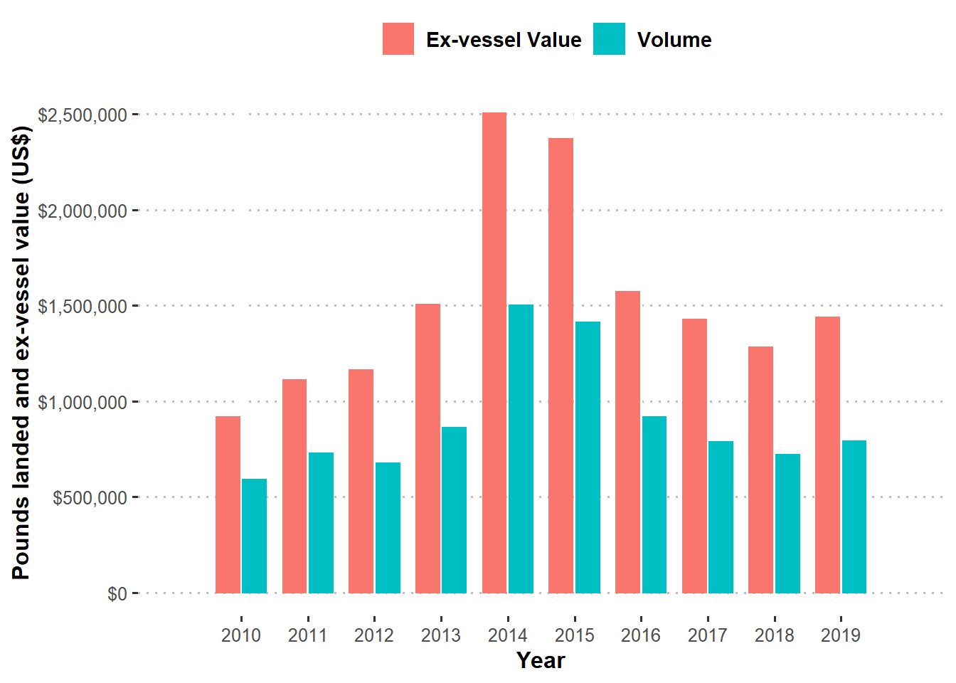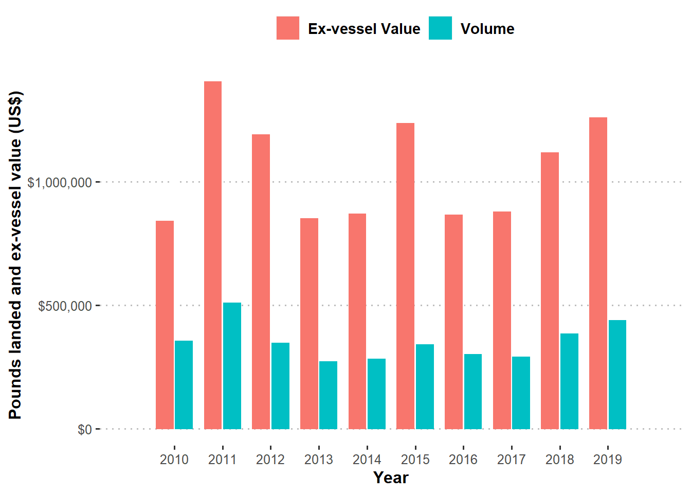 This type of landings distribution can indicate resiliency of a fishery in the face of economic or environmental pressures. As fish abundance and market prices shift fishers can catch a variety of species and nimbly move from one fishery to the next.