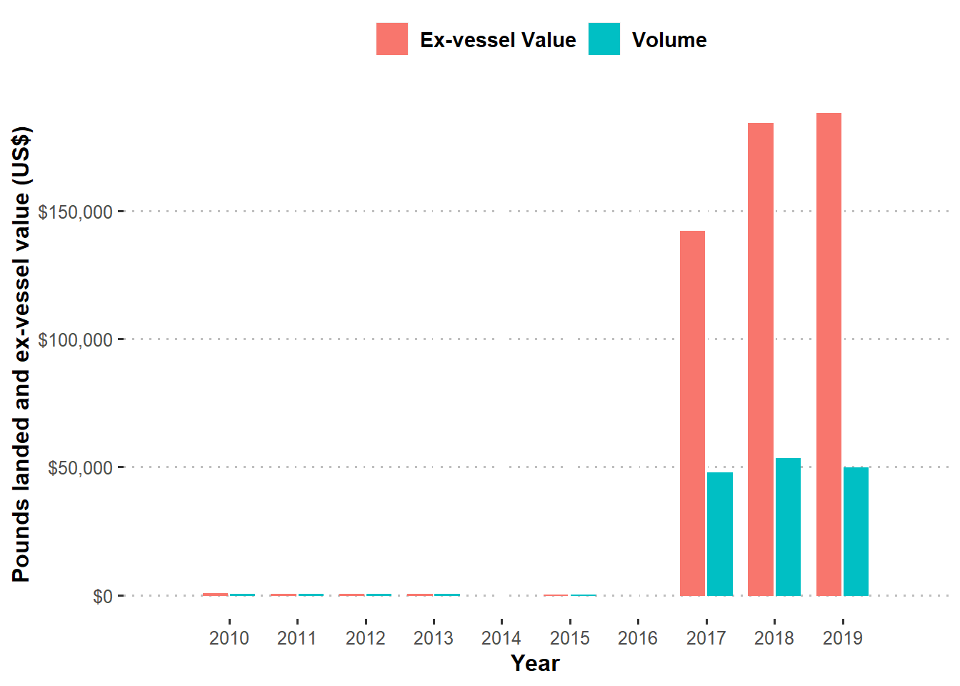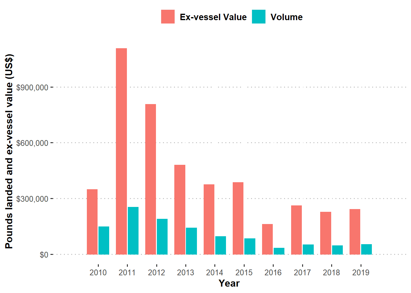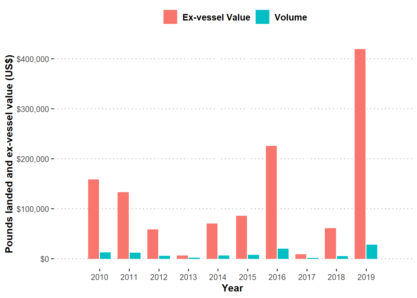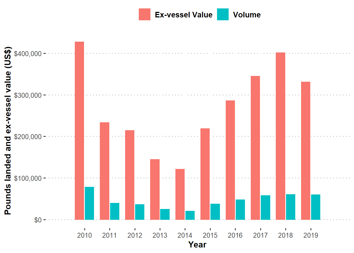 This type of landings distribution can indicate resiliency of a fishery in the face of economic or environmental pressures. As fish abundance and market prices shift fishers can catch a variety of species and nimbly move from one fishery to the next.