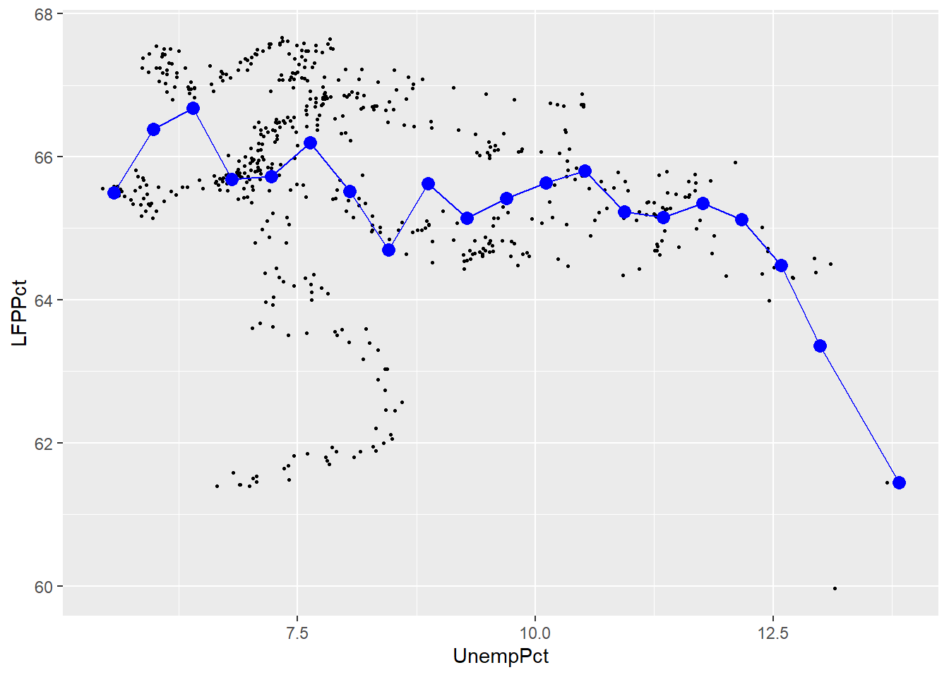 An alternative to binned averaging is smoothing, which calculates a smooth curve that fits the data as well as possible. There are many different techniques for smoothing, but they are all based on taking a weighted average of \(y_i\) near each point, with high weights on observations with \(x_i\) close to that point and low (or zero) weights on observations with \(x_i\) far from that point. The calculations required for smoothing can be quite complex and well beyond the scope of this course.