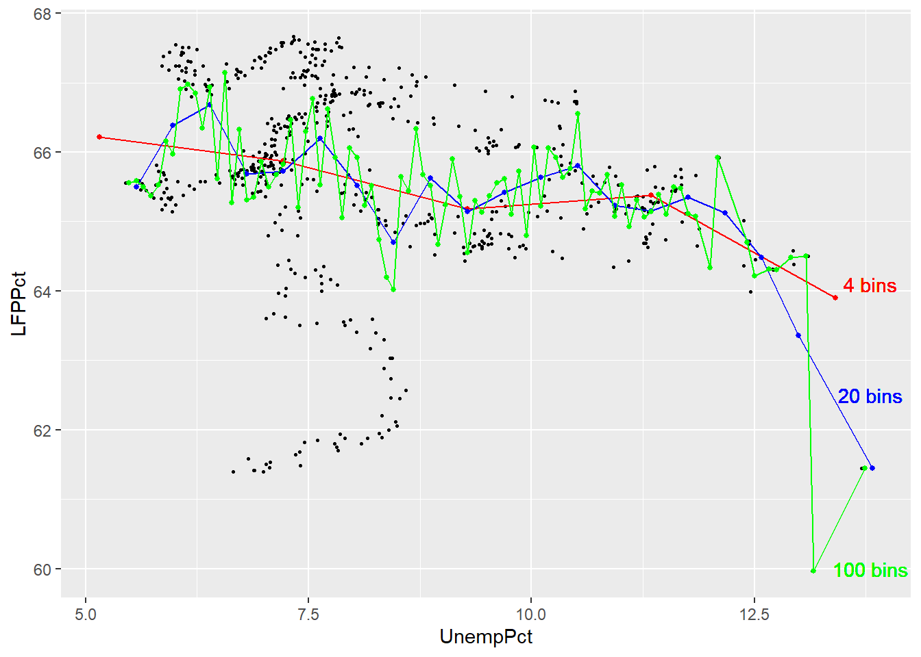 As you can see, the binned scatterplot tends to be smooth when there are only a few bins, and jagged when there are many bins. This reflects a trade-off between bias (too few bins may lead us to miss important patterns in the data) and variance (too many bins may lead us to see patterns in the data that aren’t really part of the DGP).