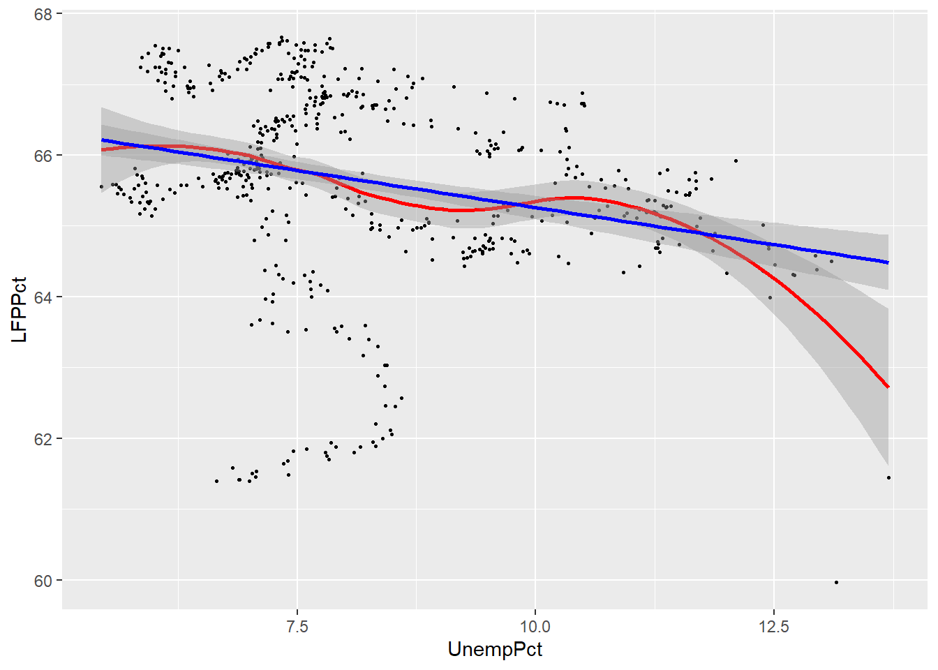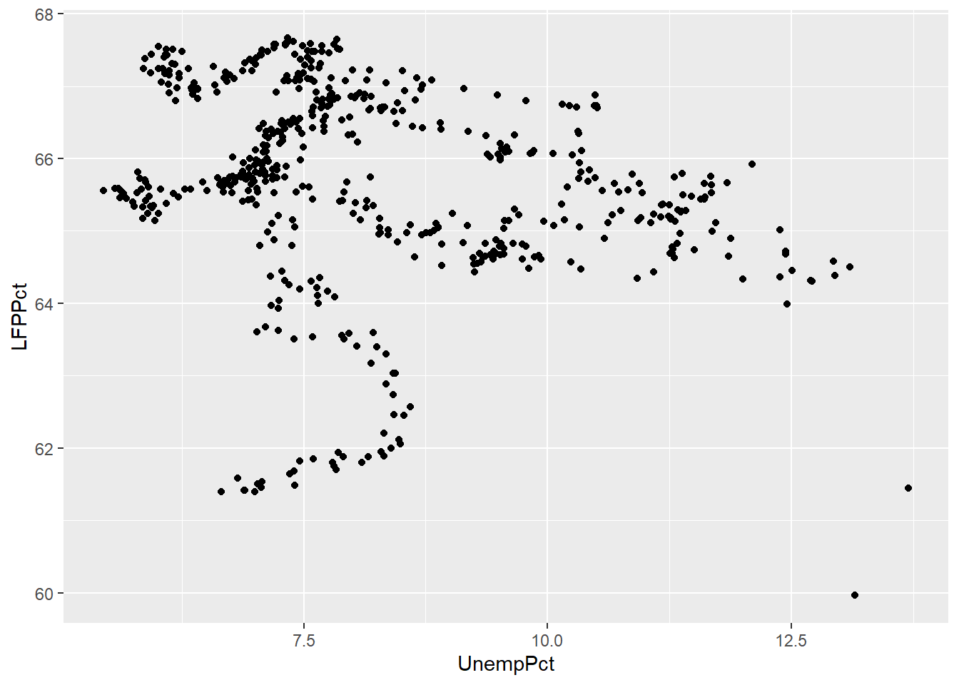 ## [1] -0.2557409As you can see, unemployment and labour force participation are negatively correlated: when unemployment is high, LFP tends to be low. This makes sense given the economics: if it is hard to find a job, people will move into other activities that take one out of the labour force: education, childcare, retirement, etc.