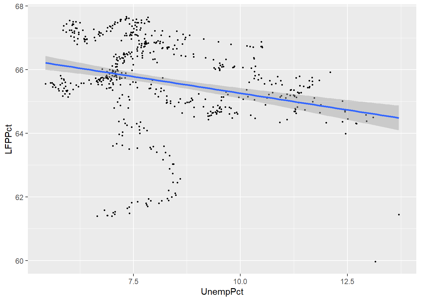 ggplot(data = EmpData, aes(x = UnempPct, y = LFPPct)) + geom_point(size = 0.5) +