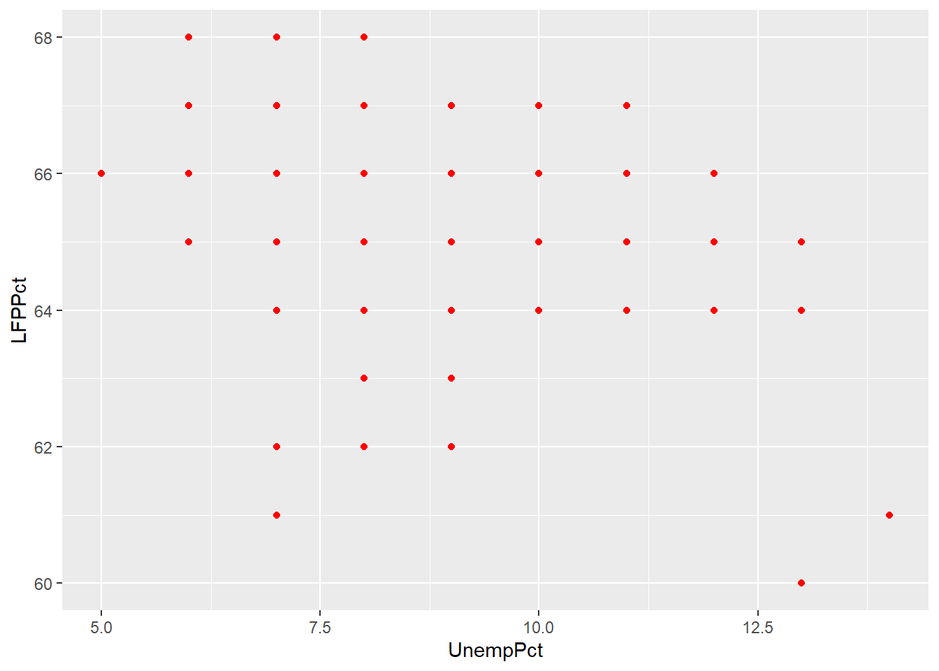 ggplot(data = RoundedEmpData, aes(x = UnempPct, y = LFPPct)) + geom_point(col = "red") +
