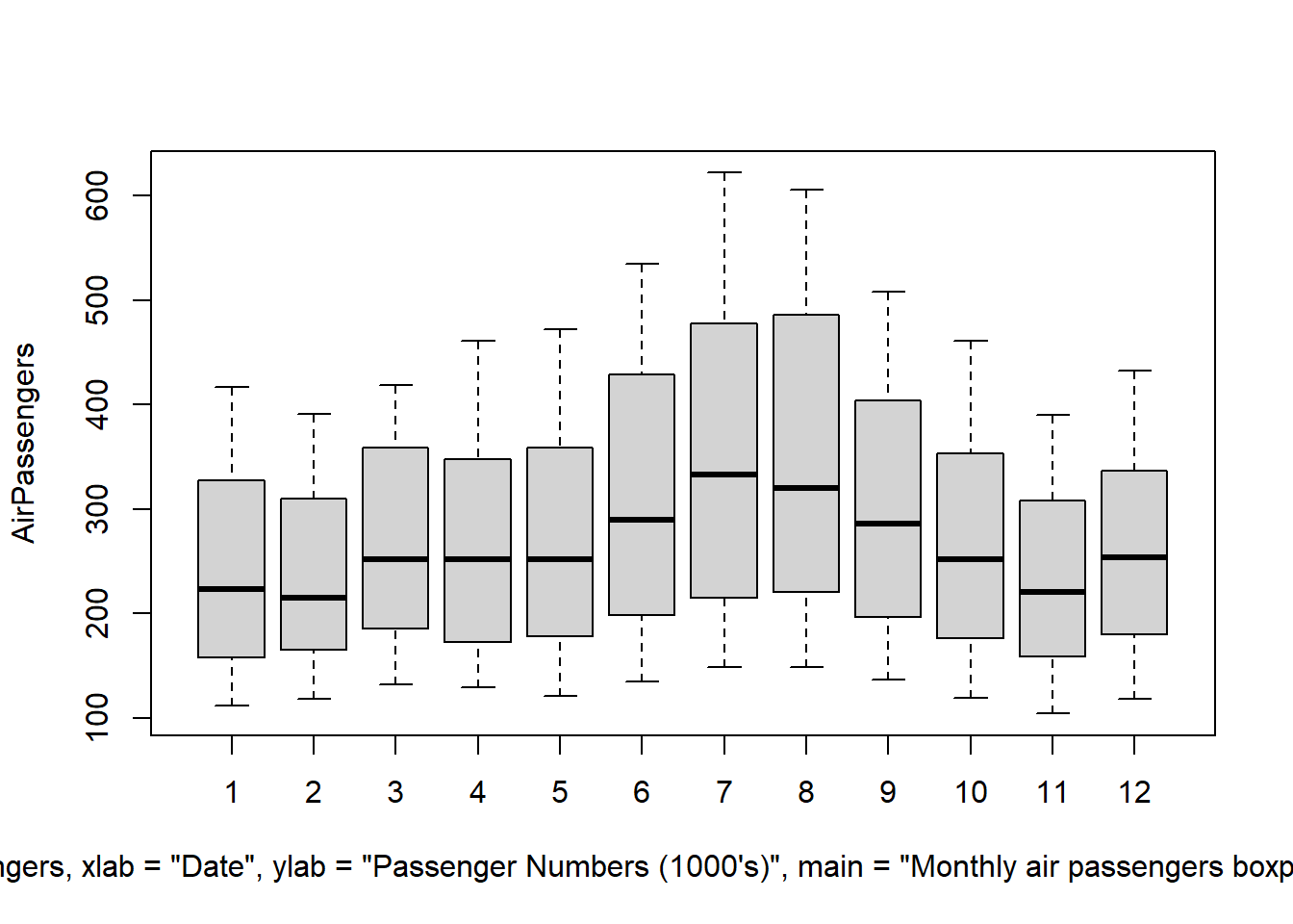 boxplot(AirPassengers~cycle(AirPassengers, xlab="Date",