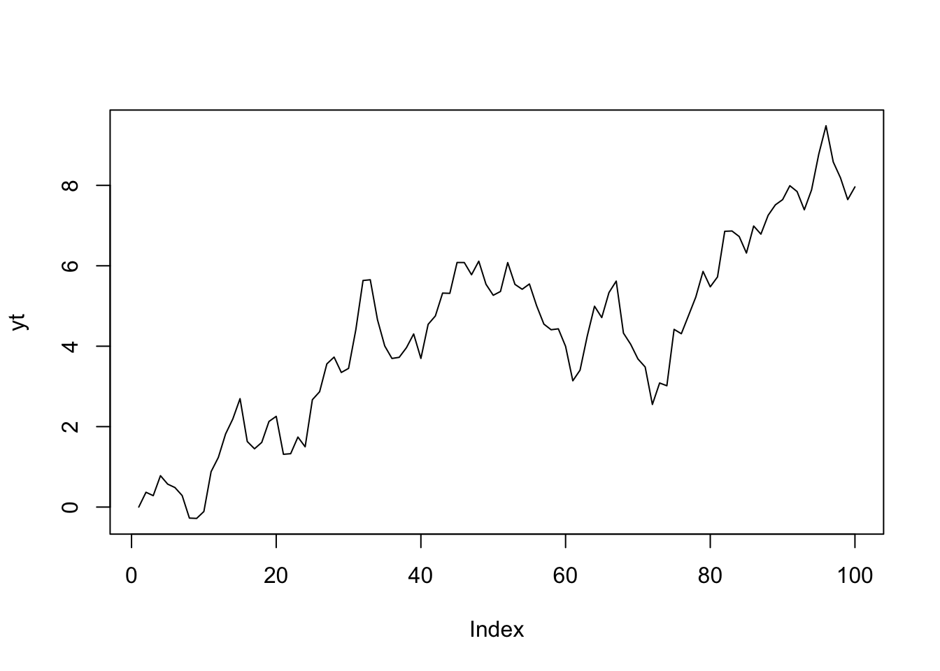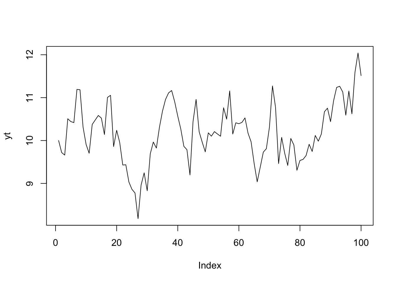 yt[t] <- alpha + phi*yt[t-1] + rnorm(1, 0, .5)