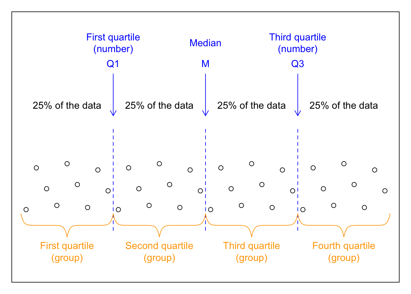 • in the second meaning, a quartile refers to observations that fall into a specific quarter with respect to the characteristic being analyzed. To avoid ambiguity, the term “quartile group” can be used.