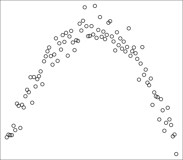 Question 8.1 (Freedman, Pisani, and Purves 2007) According to your intuition, what is the Pearson correlation coefficient for the data illustrated on this scatter plot? Is there a correlation (association) between x and y?