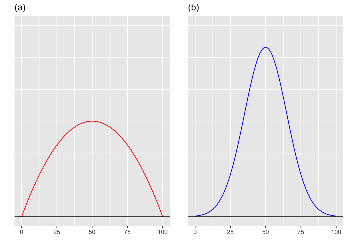 Question 4.2 (Freedman, Pisani, and Purves 2007)The two histogram sketches (density functions) are presented below. Which variable is more dispersed?