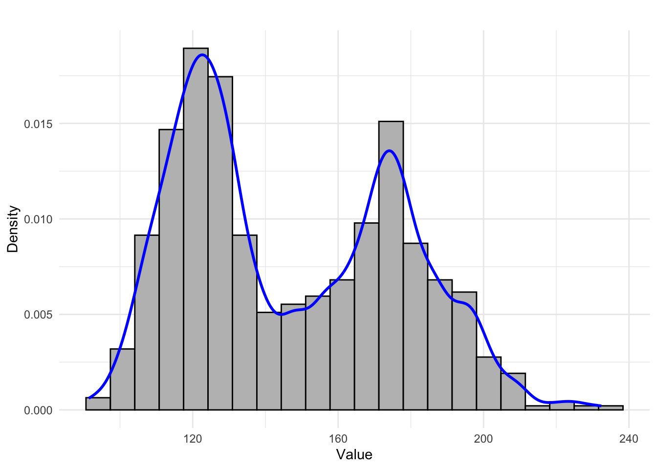 A kernel density estimator is a smooth curve that estimates the probability density function of a continuous variable. Unlike histograms, which are blocky and depend on bin width and placement, kernel density plots provide a continuous and often more visually appealing representation of the distribution.