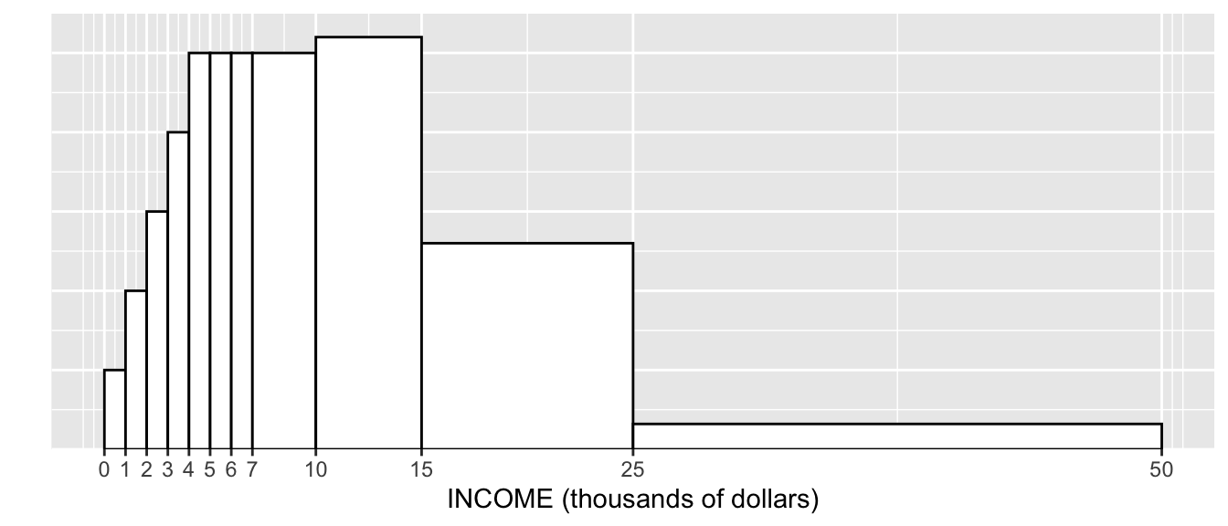 Exercise 2.2 (Freedman, Pisani, and Purves 2007) This graph shows the distribution of families by income in the United States in 1973.
