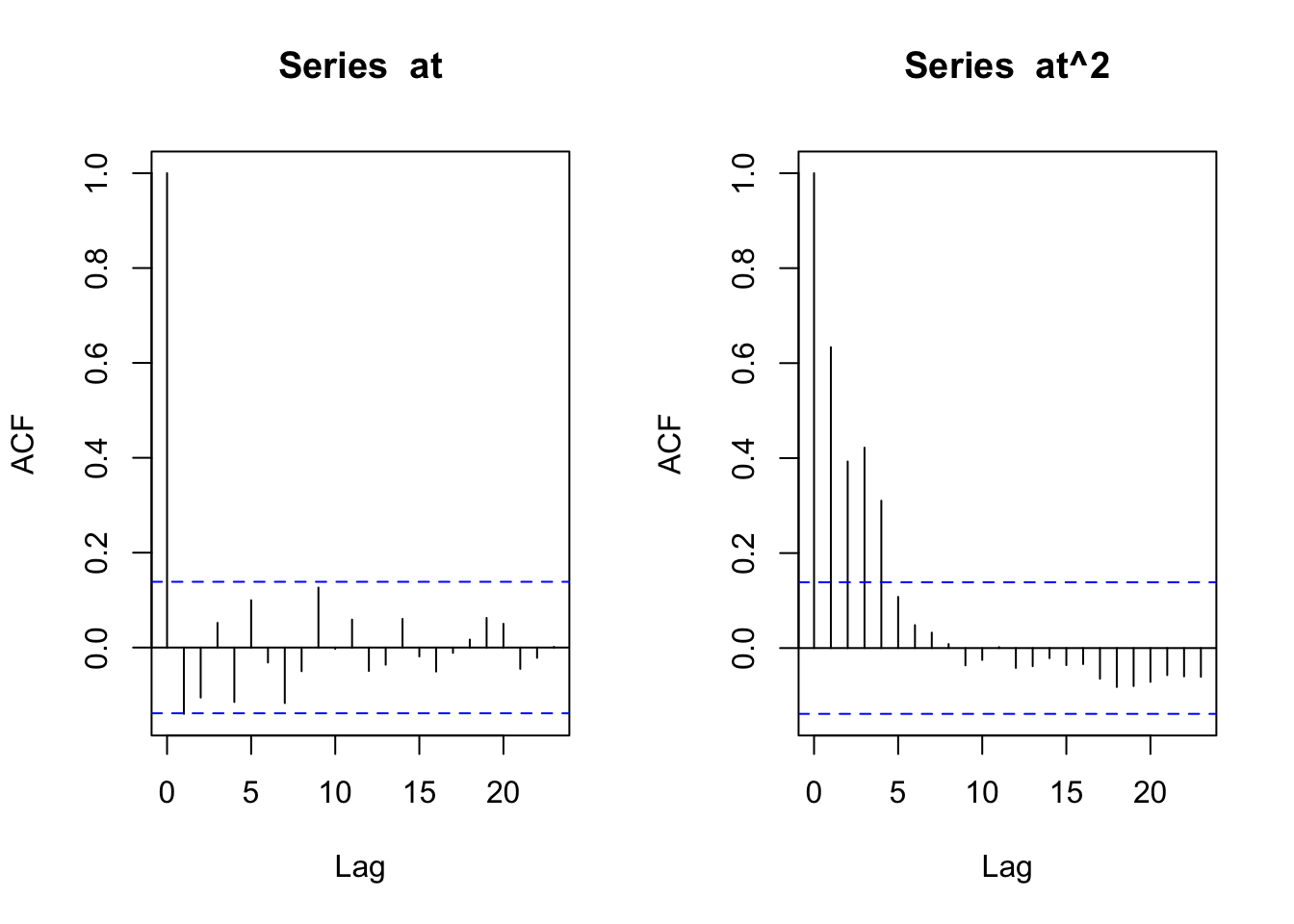Equation (10.7) explains how GARCH models work. When \(a_{t-1}\) has a large absolute value, the standard deviation \(\sigma_t\) will also be larger than usual. This increases the likelihood of observing a large \(a_t\). Conversely, small \(a_{t-1}\) leads to a smaller and reduced variability in \(a_t\).