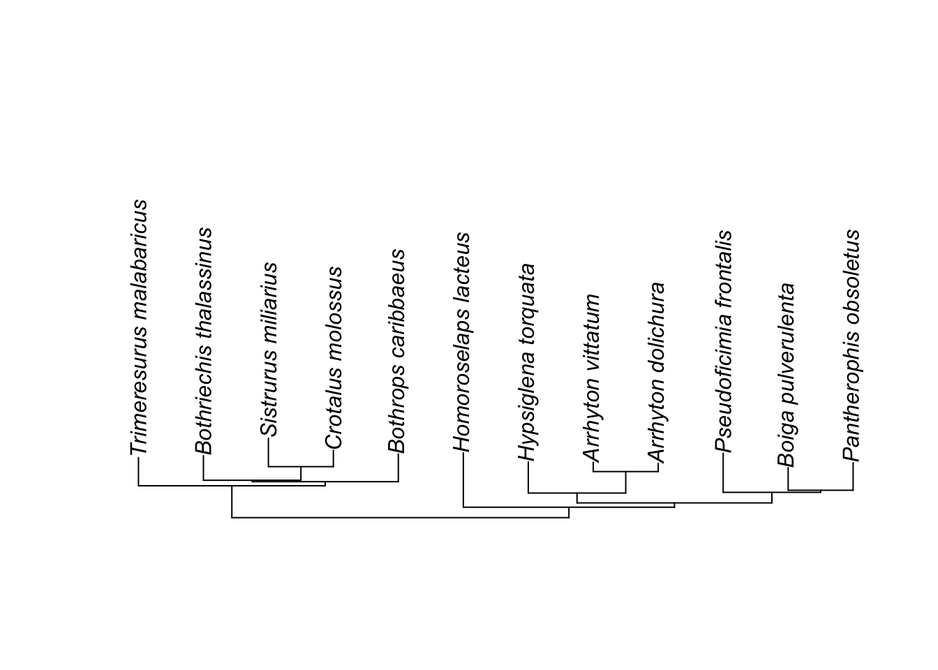 To start, let’s take a sample tree: a tree of snakes by Pyron R.A., Burbrink F., Colli G., Montes de oca A.N., Vitt L.J., Kuczynski C.A., & Wiens J.J. 2010. The phylogeny of advanced snakes (Colubroidea), with discovery of a new subfamily and comparison of support methods for likelihood trees. Molecular Phylogenetics and Evolution 58 (2): 329-342. [#TODO: add proper citation]. It is a tree of 767 taxa. But we’ll start with a 12 tip subtree.
