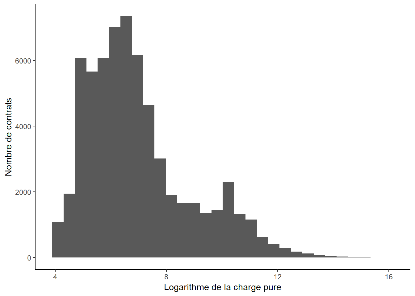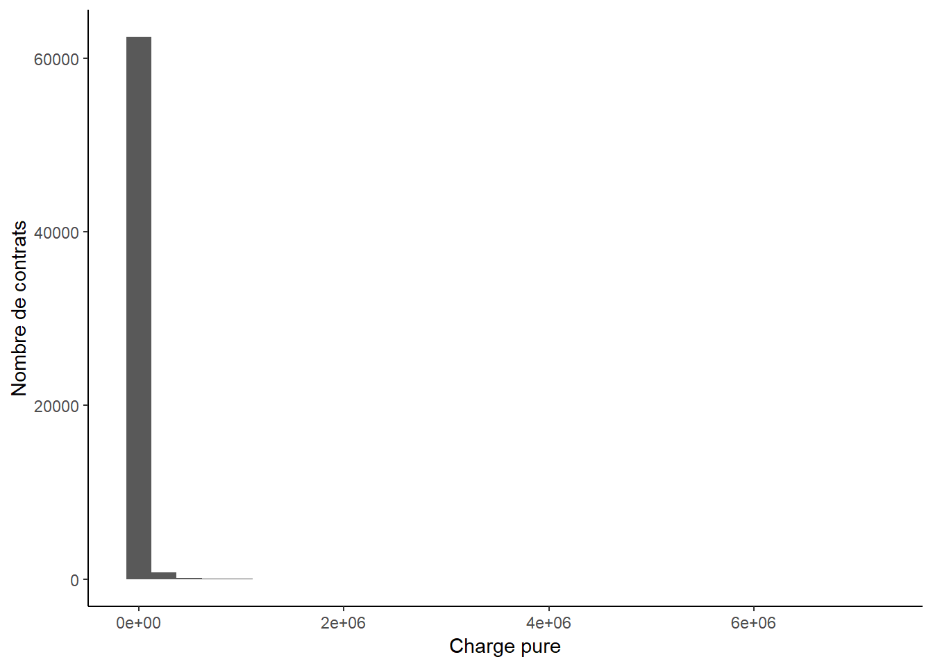 Dans tous les cas, pour le calcul de la prime pure, on voit ainsi qu’il n’est pas simple de résumer à une seule valeur la distribution de la charge totale de la base de données utilisée. Ce ne sont pas toutes les bases de données en assurance qui ont la même distribution de la charge pure. Certains produits d’assurance ont une masse à zéro plus grande ou plus petite, une proportion différente de petites valeurs de la charge pure est observée, les valeurs maximales ne sont pas les mêmes, etc.