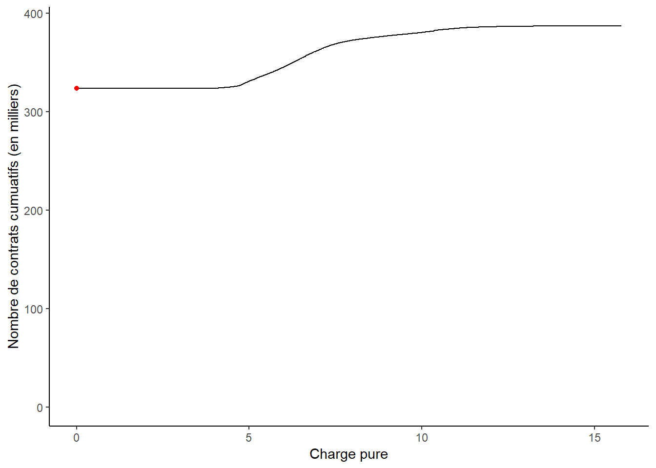Pour chaque valeur de la charge pure en abscisses, la valeur de la courbe indique le nombre de contrats du portefeuille qui a une valeur de charge pure inférieure. Le point rouge indique ainsi le nombre de contrats ayant une valeur de la charge pure nulle, et la plus grande valeur observée pour la charge pure, (soit 7,151,107, avec log(7,151,107) = 15.78) génère une valeur de 386,883 correspondant au nombre de contrats du portefeuille.