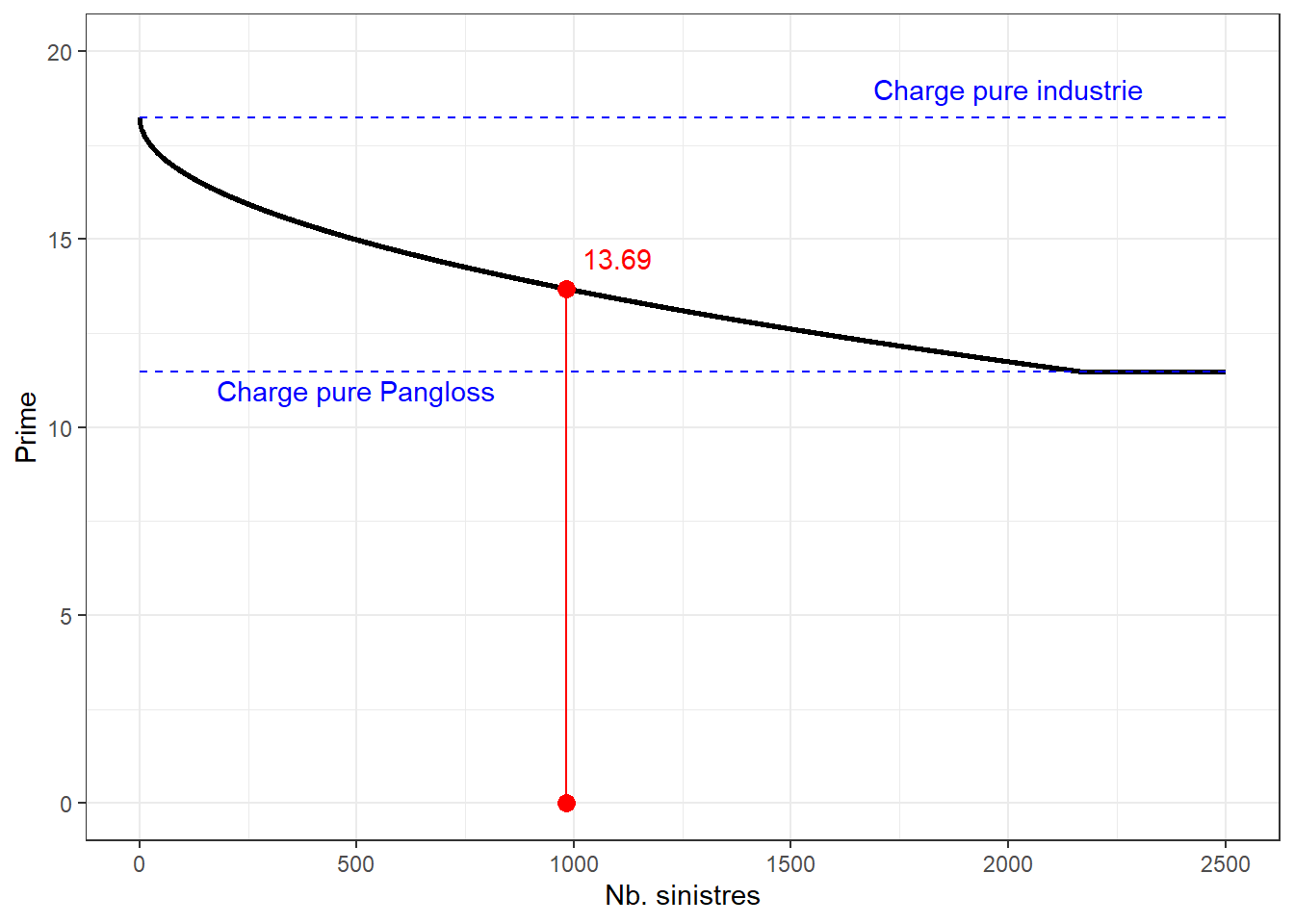 Il pourrait être intéressant d’analyser la prime crédibilisée de Pangloss Automobile en fonction de son nombre de réclamations observés.