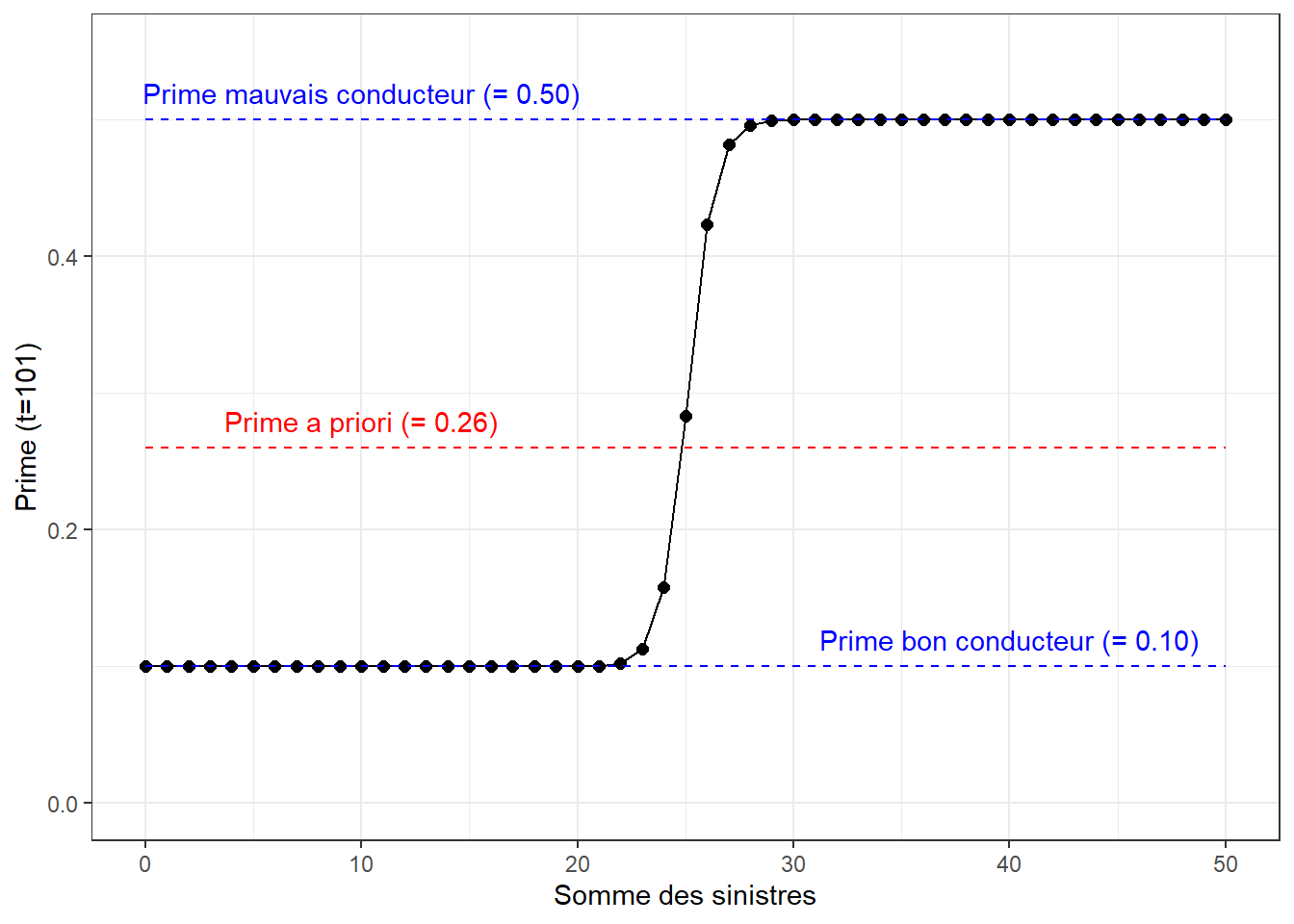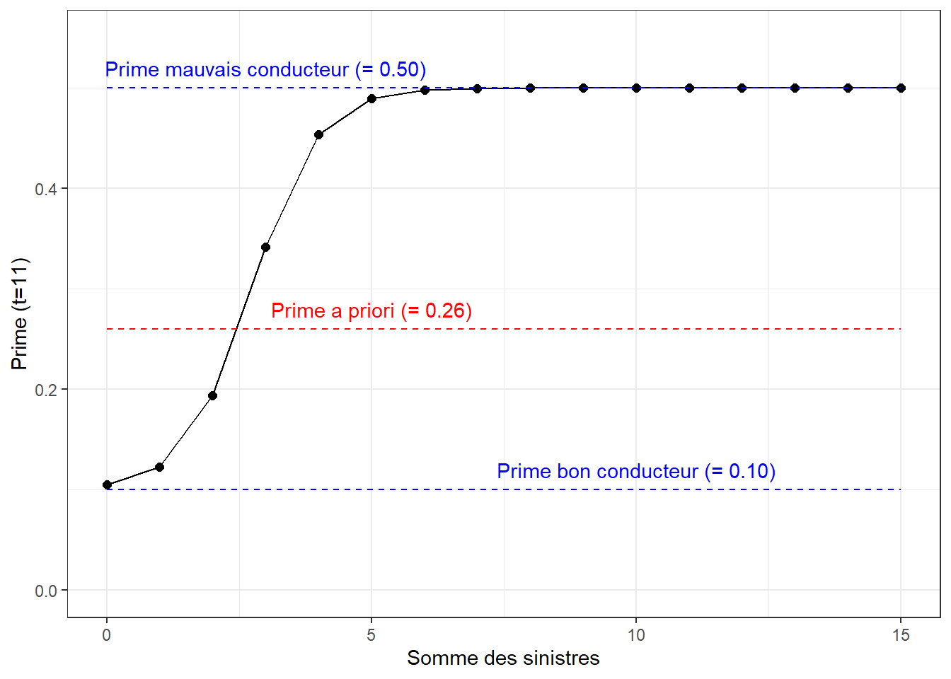 Pour les valeurs choisies dans l’application informatique, on voit que la probabilité que l’assuré soit un bon conducteur approche zéro rapidement lorsque \(k\) augmente, ce qui fait que la prime tend vers \(0.50\), le nombre de réclamations attendues d’un mauvais conducteur.