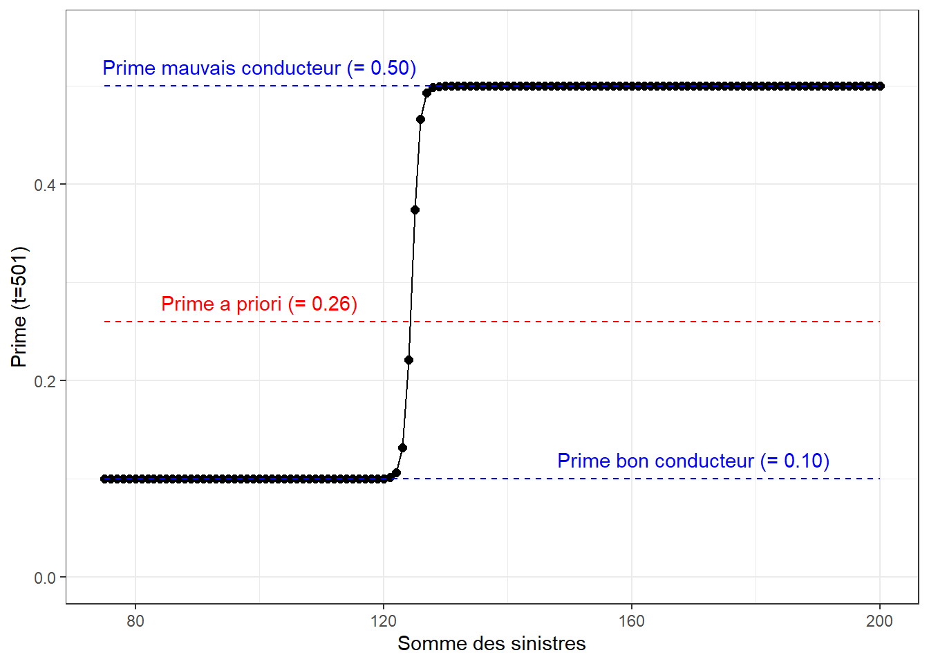 La diminution de prime est lente: la seule manière d’avoir une diminution de prime est de ne pas réclamer. Dans un tel cas, la prime passe de \(0.26\) à \(0.224\). À l’inverse, l’augmentation de prime peut être rapide si l’assuré réclame beaucoup.