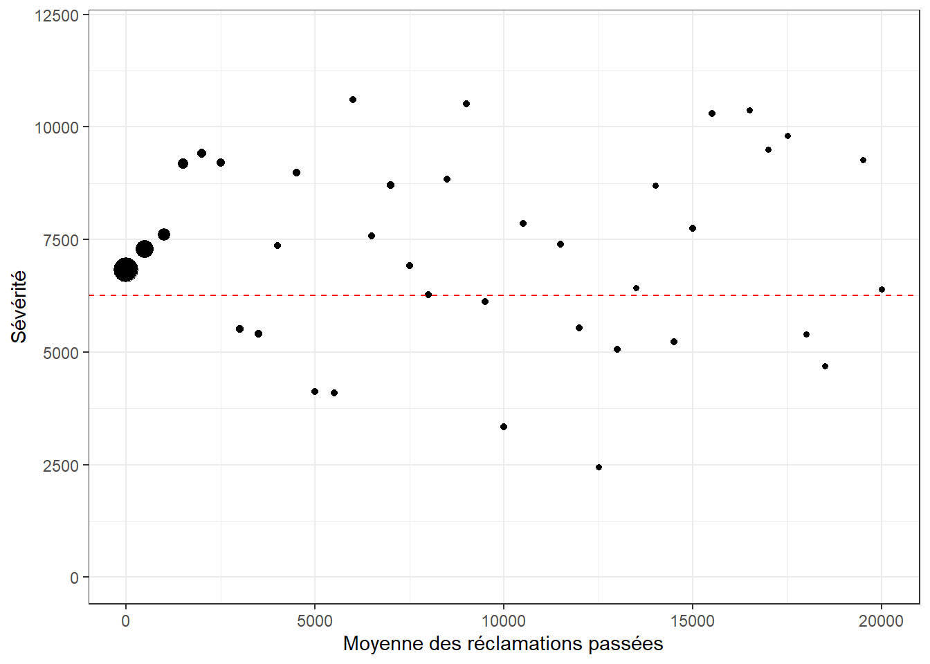 Les résultats des données sont peu concluants. Pour les petites réclamations, les 6 premiers points pour moins de 3000$, on semble voir que la sévérité moyenne augmente en fonction de la moyenne des réclamations. Ces trois points qui sont assez gros et qui composent ainsi une proportion importante des sinistres, sont supérieurs à la ligne rouge. Si cette tendant était restée pour les autres points, on aurait pu proposer que le coût des réclamations passées donne une indication de la sévérité future. Par contre, pour une moyenne de réclamations supérieure à 3000$, aucune tendance claire n’est visible.