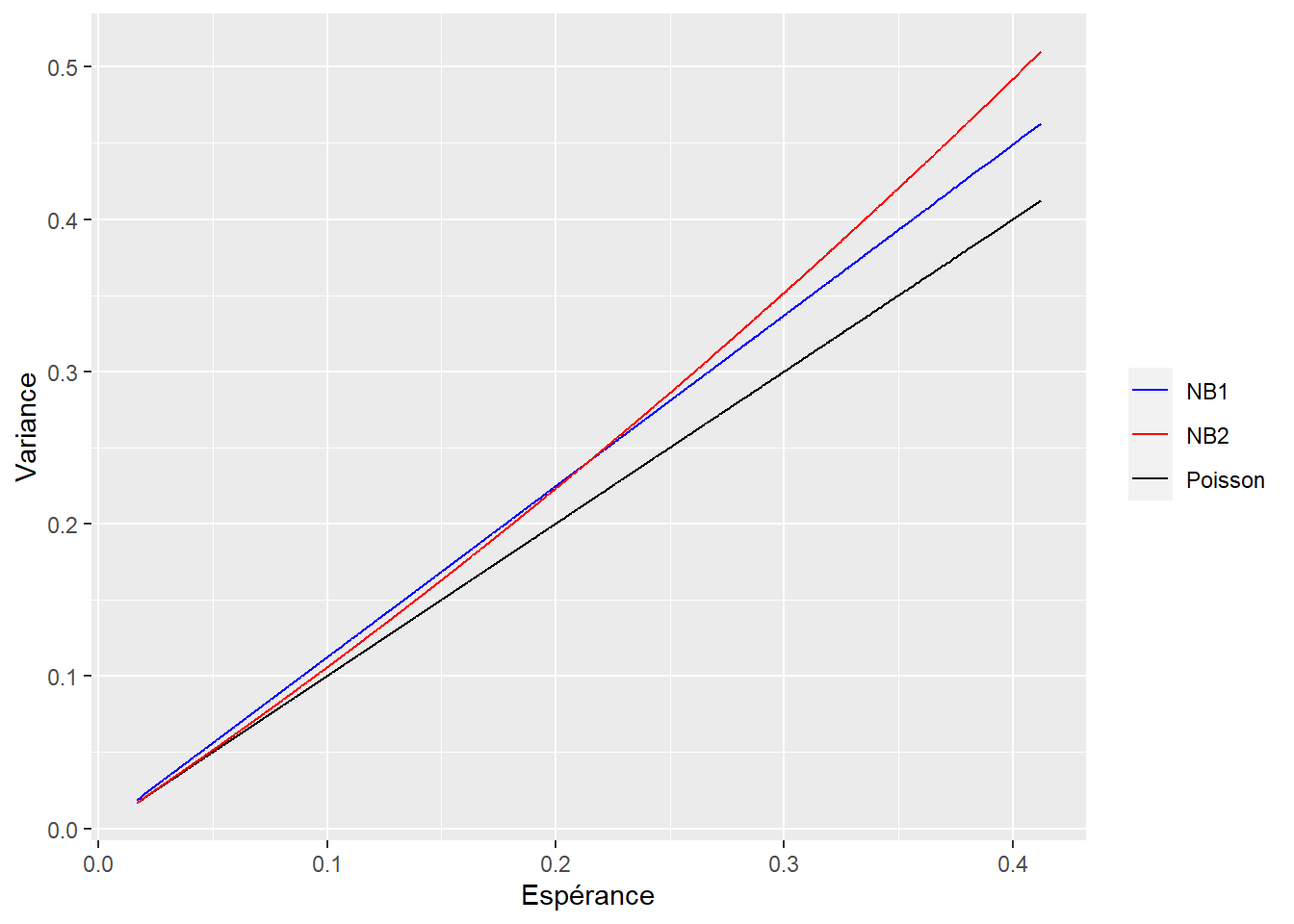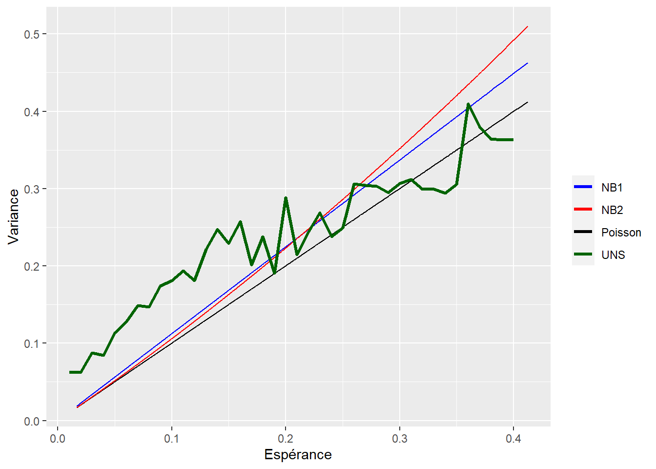 Ceci n’est qu’une première analyse, mais nous pouvons voir que ni la forme paramétrique de la NB1, ou de la NB2, ne semble convenir aux données. Si on voulait aller plus loin et trouver non seulement une meilleure estimation de la variance des paramètres, mais aussi de meilleurs paramètres, on devrait se rabbatre sur une approche appelée Poisson EE (estimating equations).