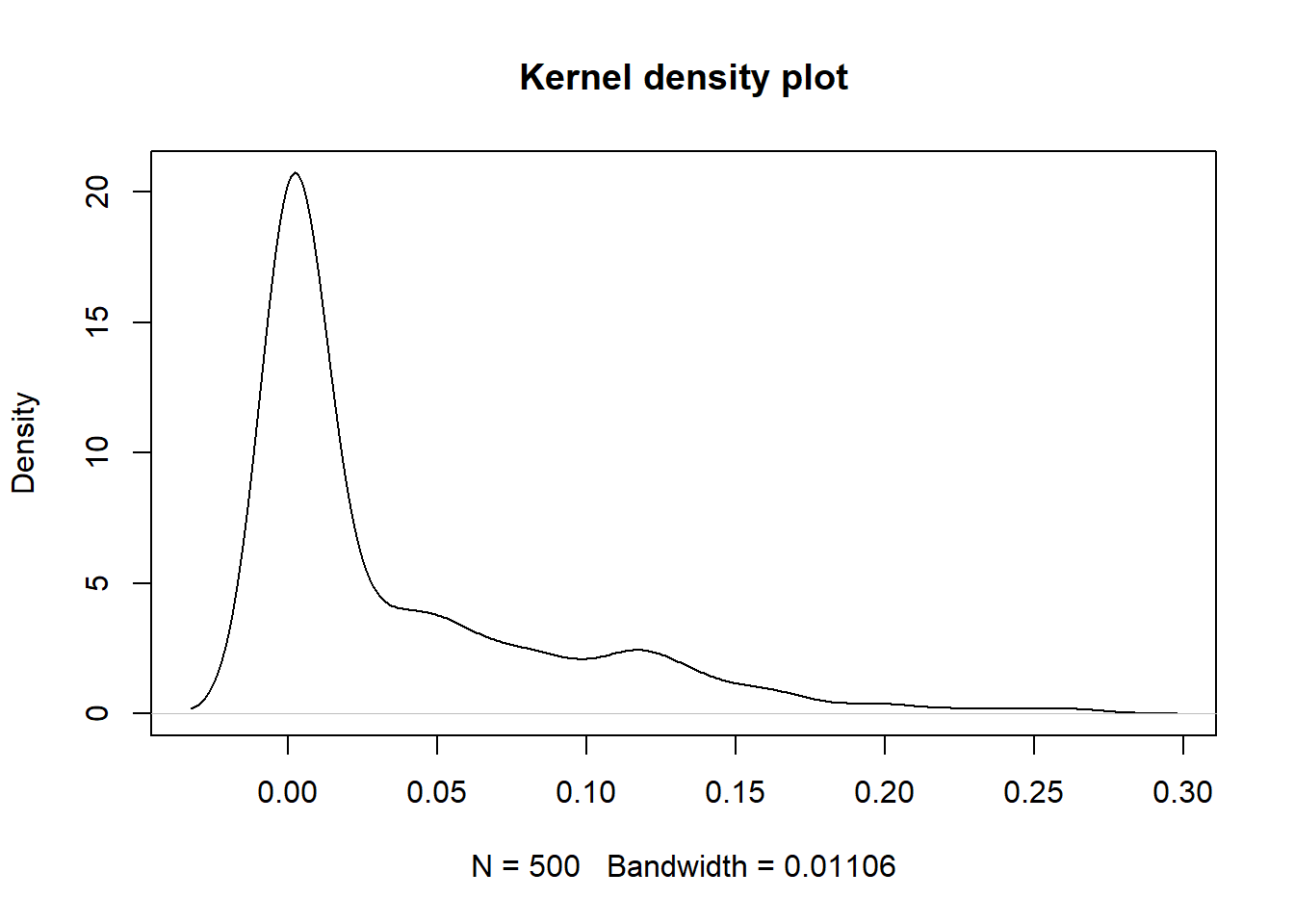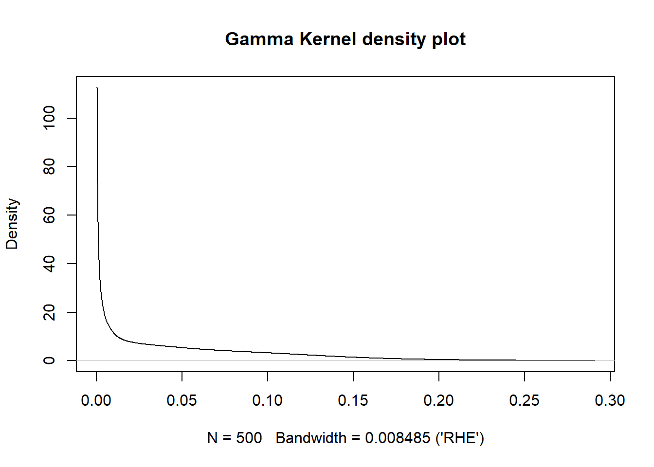 Ainsi, le graph de la densité à noyau est incorrect car il donne du poids aux valeurs inférieures à zéro. Lorsque les données analysées sont strictement positives, et que nous sommes intéressés à voir la forme de la densité, une fonction à noyau gamma est une option à considérer.