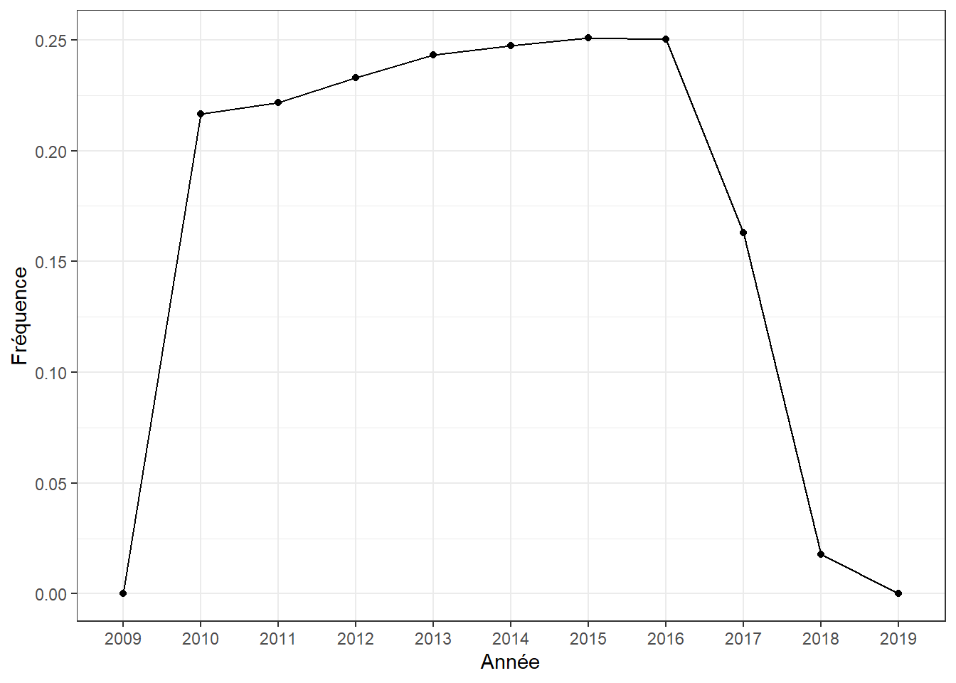 Exemple 1.6 En utilisant encore une fois le jeu de données db.fictif, illustrez la fréquence de réclamation par année (en fonction de la colonne debut).