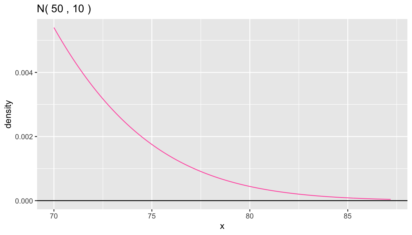 Here is a plot of the upper right tail above 70 from the previous density plot.