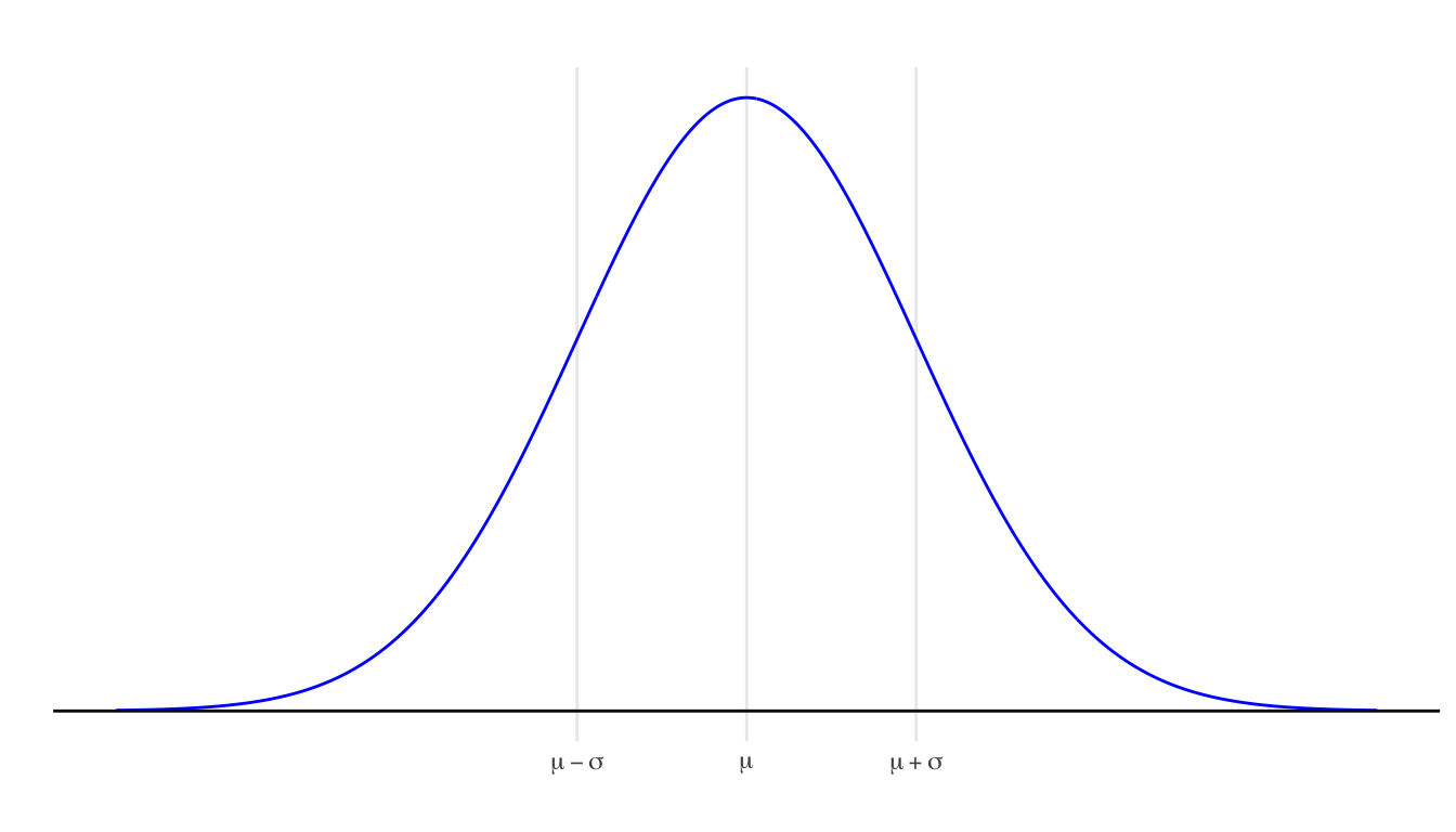 The standard normal density has mean \(\mu = 0\) and standard deviation \(\sigma = 1\).