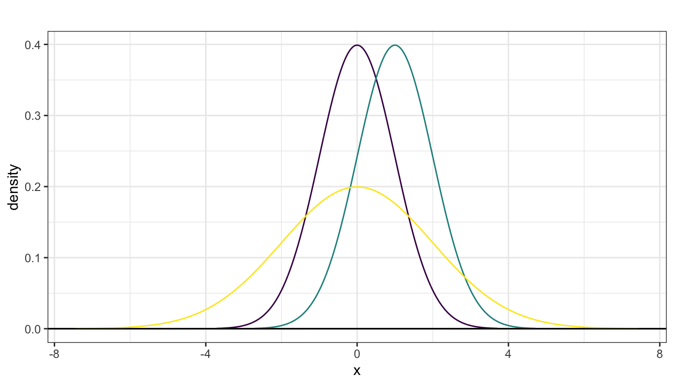 When multiple normal densities are drawn on the same axis, you can observe effects of modifying parameter values. The next plots displays densities from the following three normal distributions: