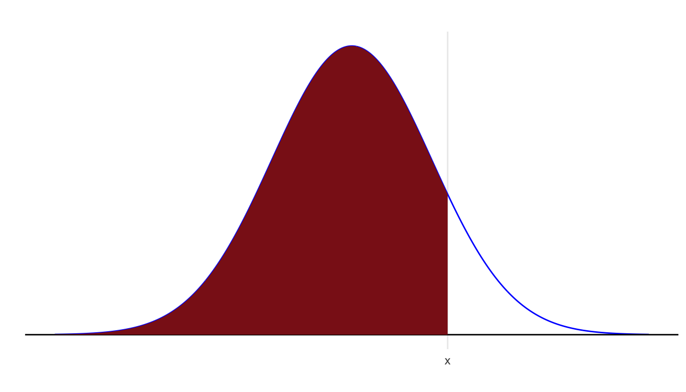 For a normal distribution, this is the area to the left of \(x\) under the corresponding normal density.