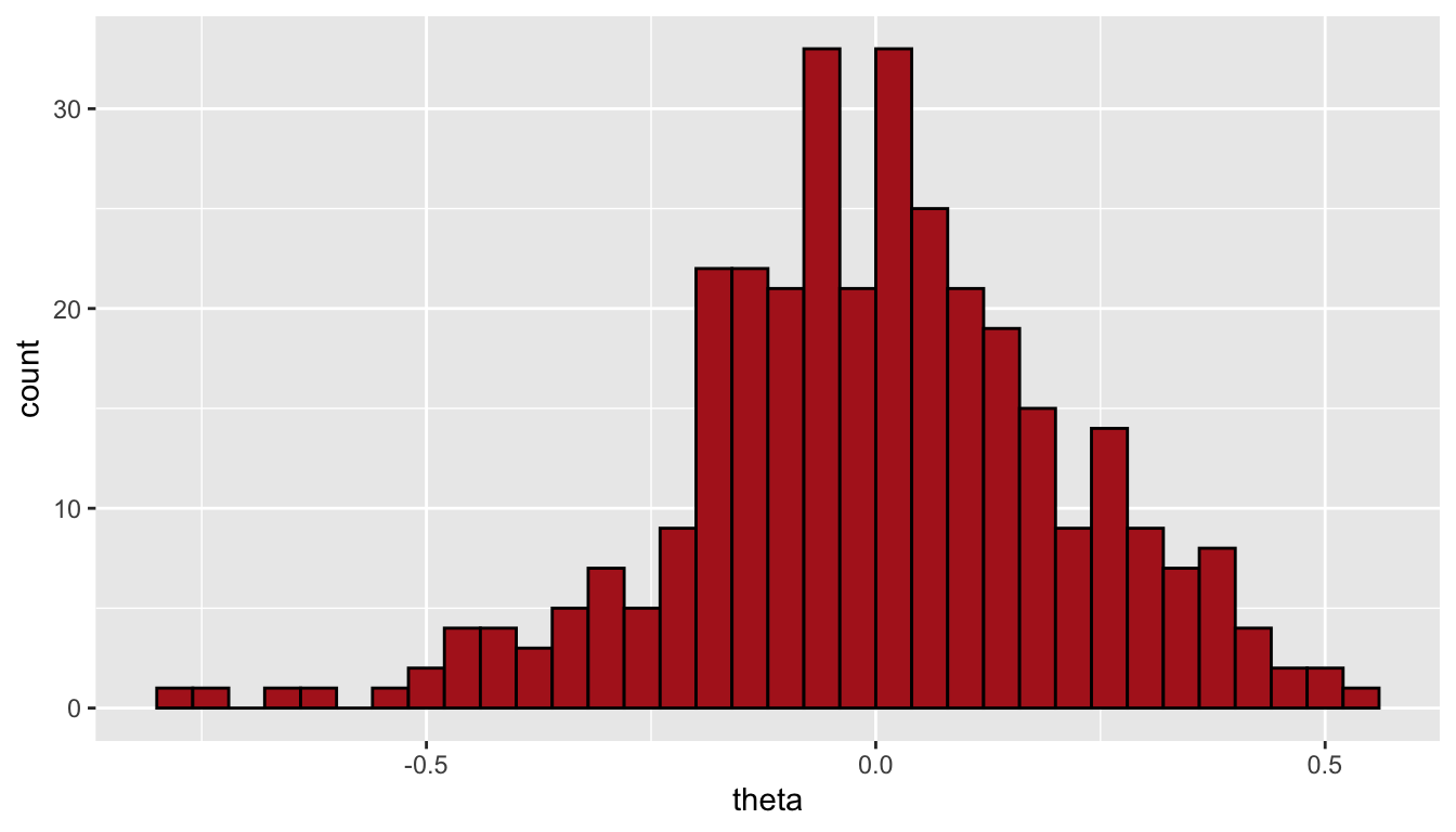 Examine the distribution of \(\theta\) values among the teams. The mean is zero (by design). The shape is more or less bell-shaped. The poor teams are a bit more extreme than the strong teams.